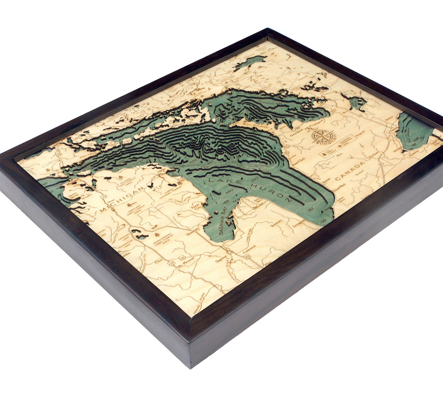 A 3-D nautical wood map featuring the second largest Great Lake. Lake Huron is home to the Georgian Bay, the largest bay in the Great Lakes, and also to Manitoulin Island, which is the largest freshwater island in the world. It's surrounded by the world's largest limestone quarries, and its beaches are sandy and shallow (excluding those along the coast of the Georgian Bay, which are rocky).
