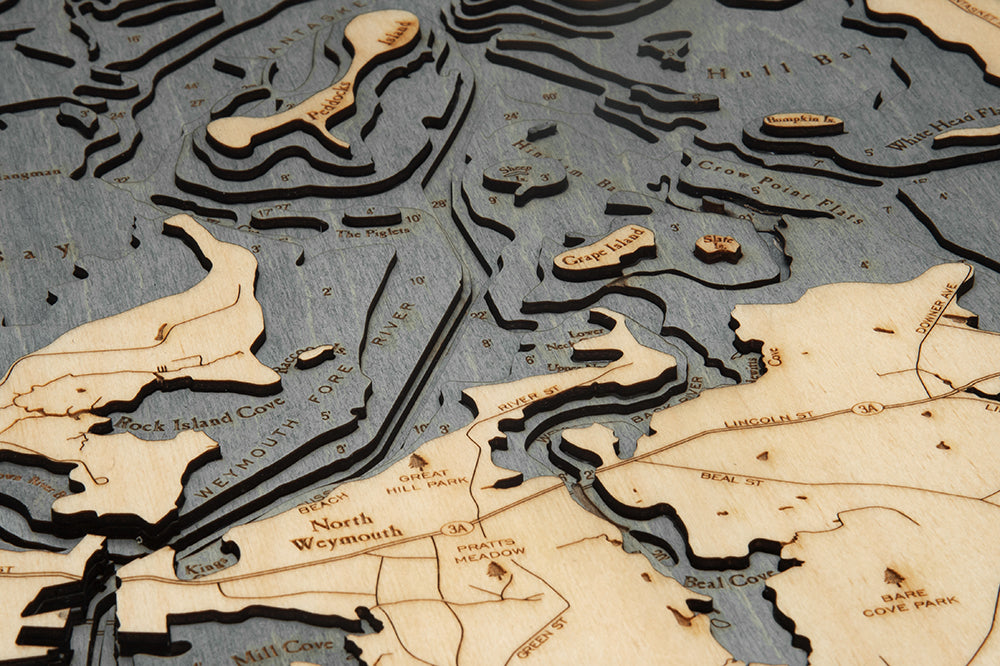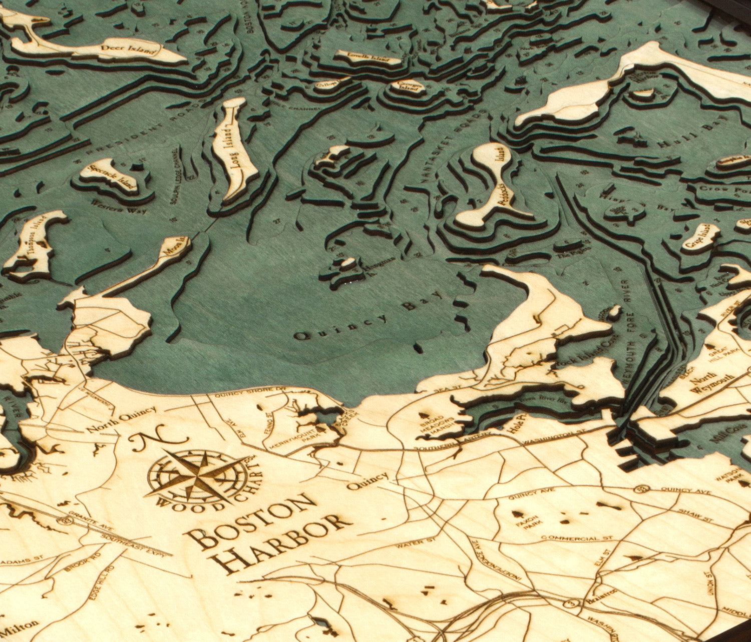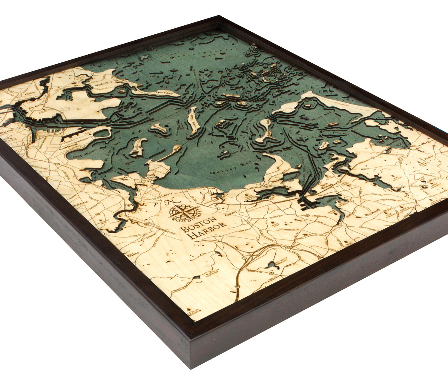 A 3-D nautical wood map featuring Boston Harbor, a natural harbor and estuary of Massachusetts Bay, and is adjacent to the city of Boston. Since its discovery by John Smith in 1614, Boston Harbor has been an important port in American history. It was the site of the Boston Tea Party, in 1773, which escalated into the American Revolution.