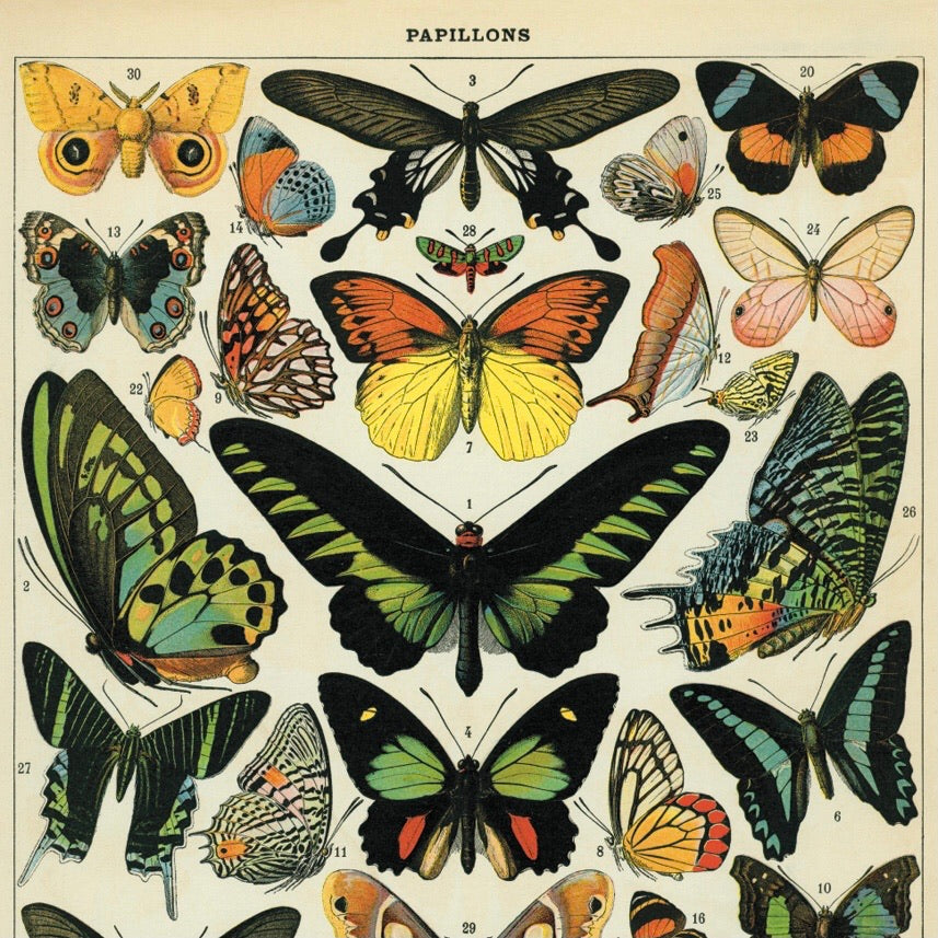 Add vintage feel to your home with this lovely butterfly school chart. Purchase this vintage reproduction print individually or upgrade to a permanent wood hanger — wood planks bookend the top and bottom and finished with a jute string for easy hanging. Choose from a variety of hanger colors by selecting from the drop down (pictures will update with selection).