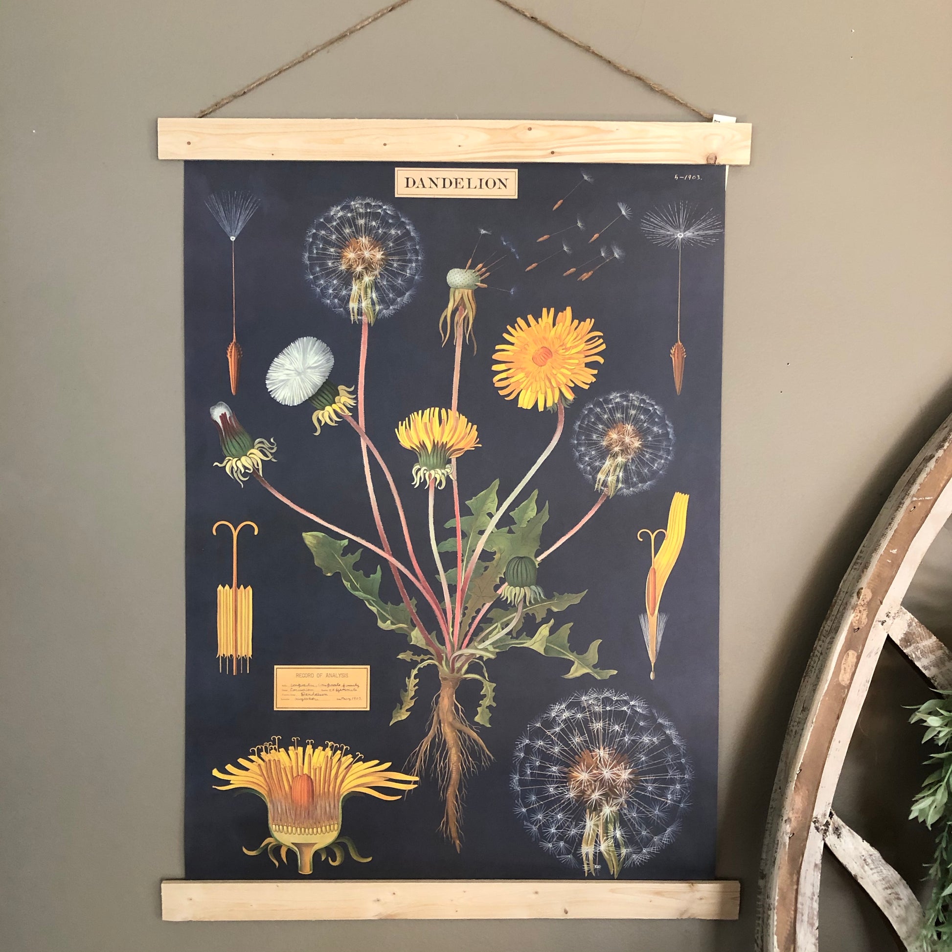 Add vintage feel to your home with this lovely dandelion poster wall hanging. Purchase this vintage reproduction print individually or upgrade to a permanent wood hanger — wood planks bookend the top and bottom and finished with a jute string for easy hanging. Choose from a variety of hanger color options.