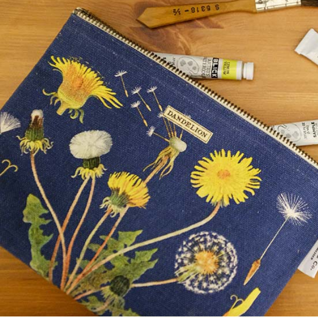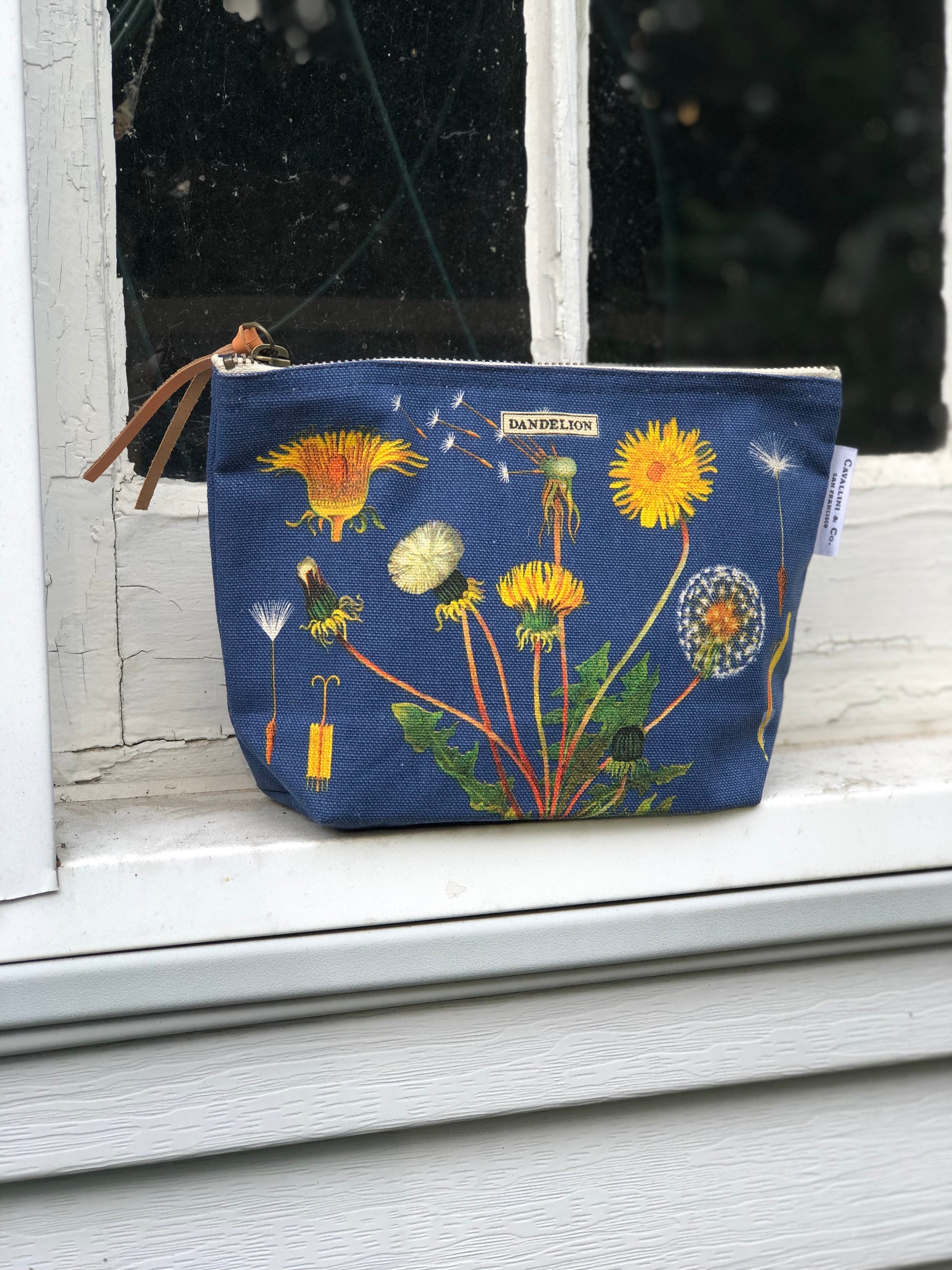 The perfect pouch for all of your pretties! Clutch features vibrant yellow dandelions on a blue background (identical print on each side). Made of 100% cotton with a lined interior and leather zipper pull. Measures 8.75" x 6" x 3”. Spot clean only.