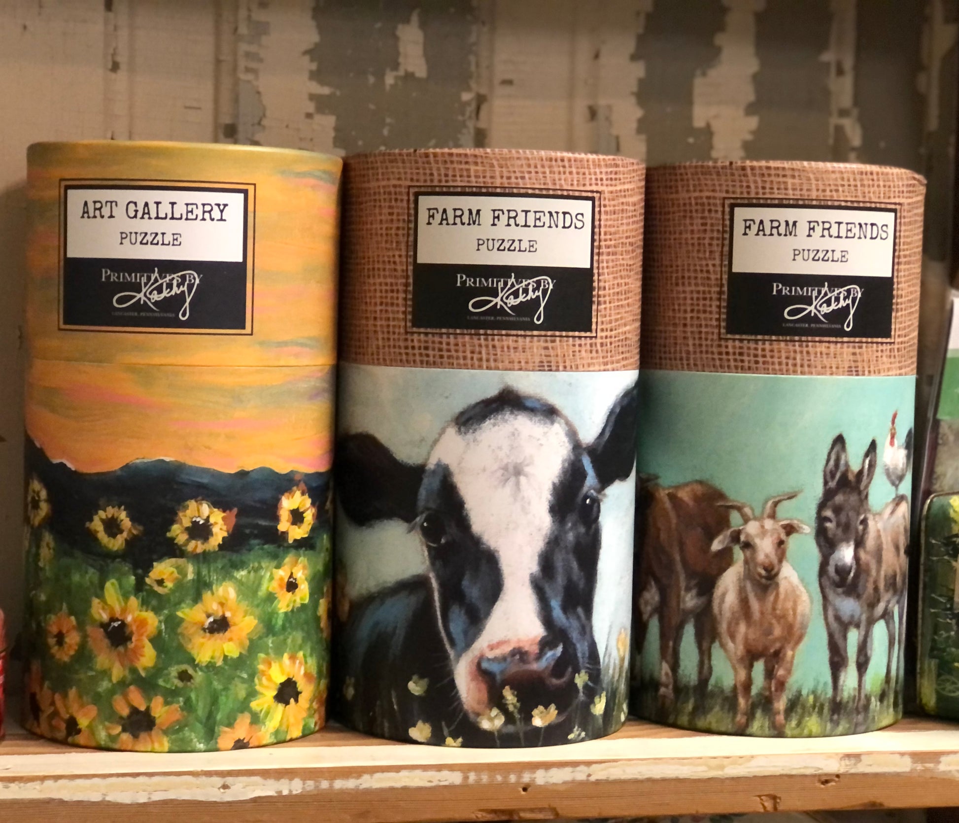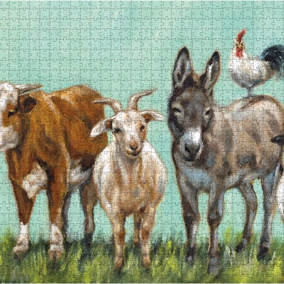 A 1,000 piece puzzle featuring a lovely farm family of animals. Puzzle pieces are packaged in a resealable plastic bag and enclosed in a cylindrical box. Finished puzzle measures 27” x 20”. Includes 10" x 8" printout of full puzzle image for reference.