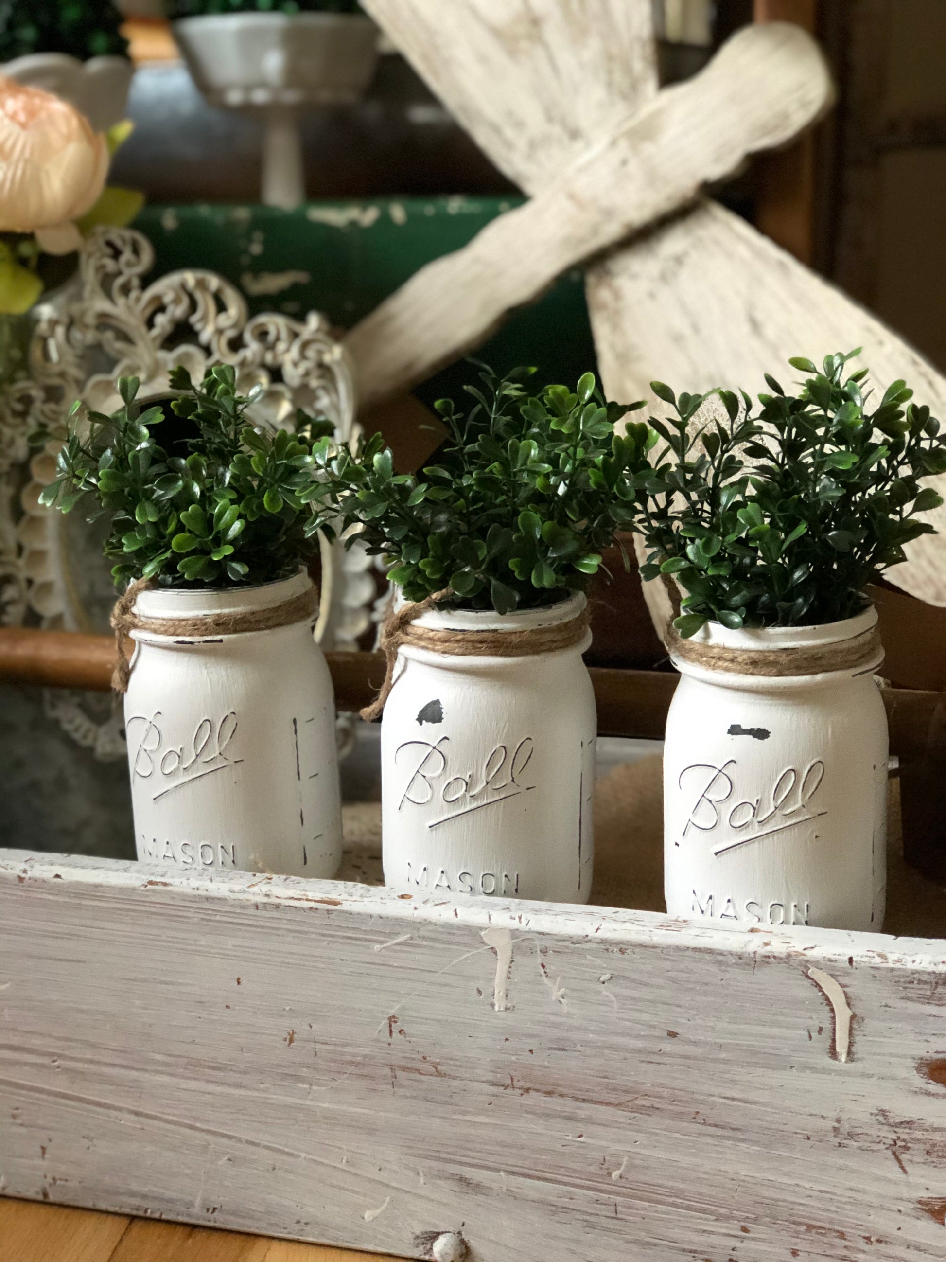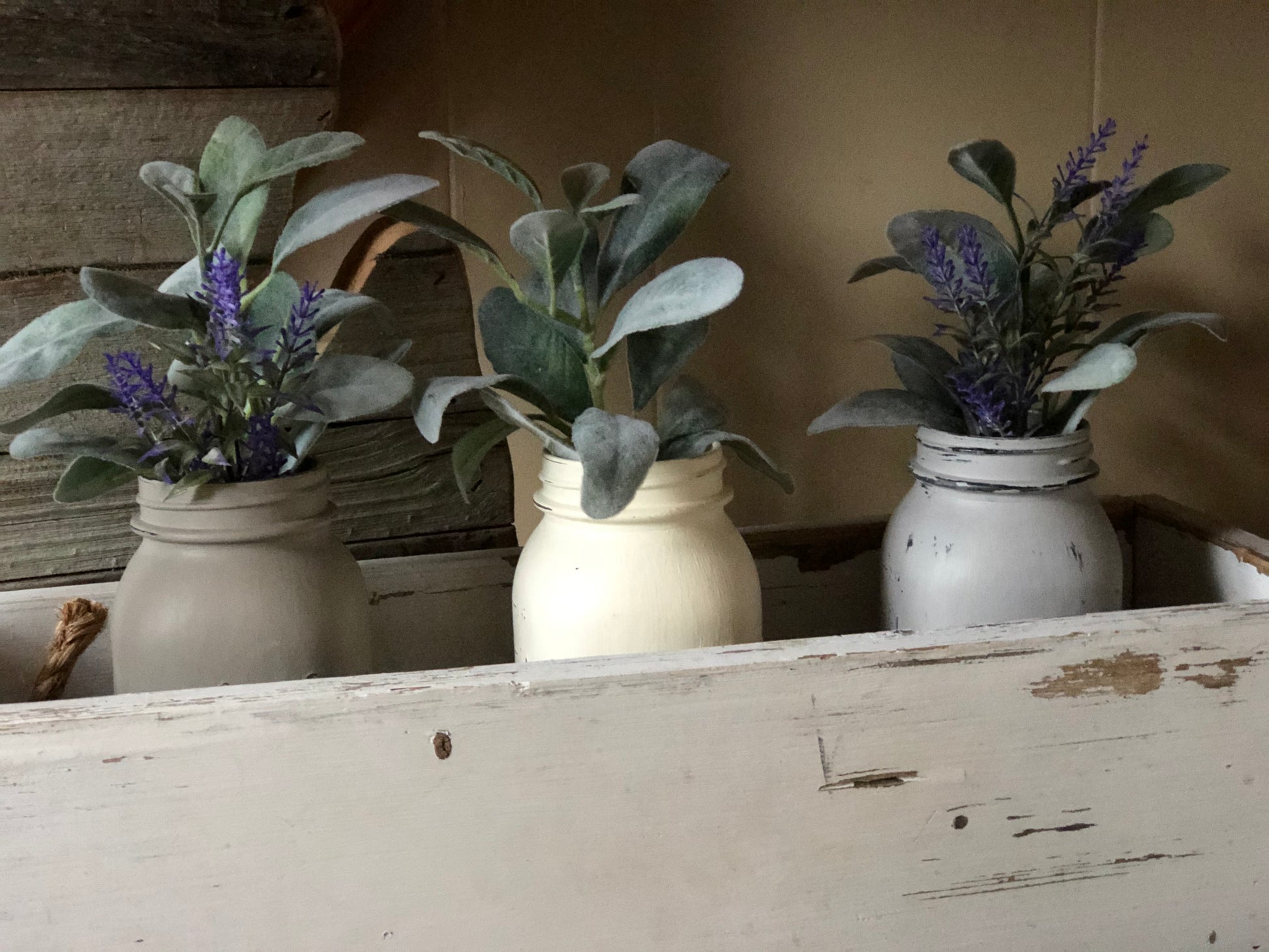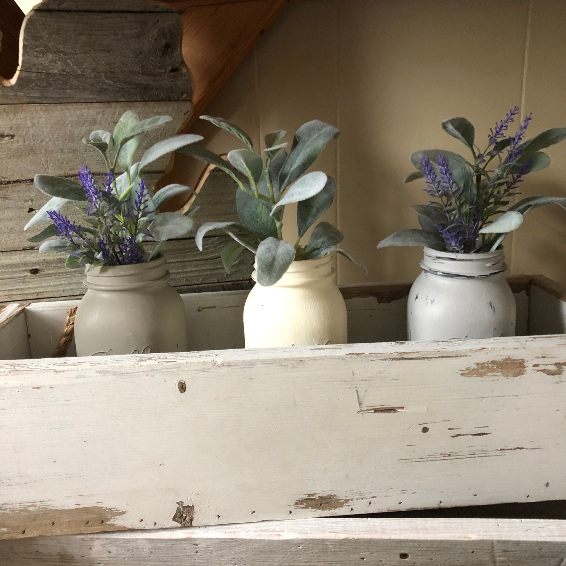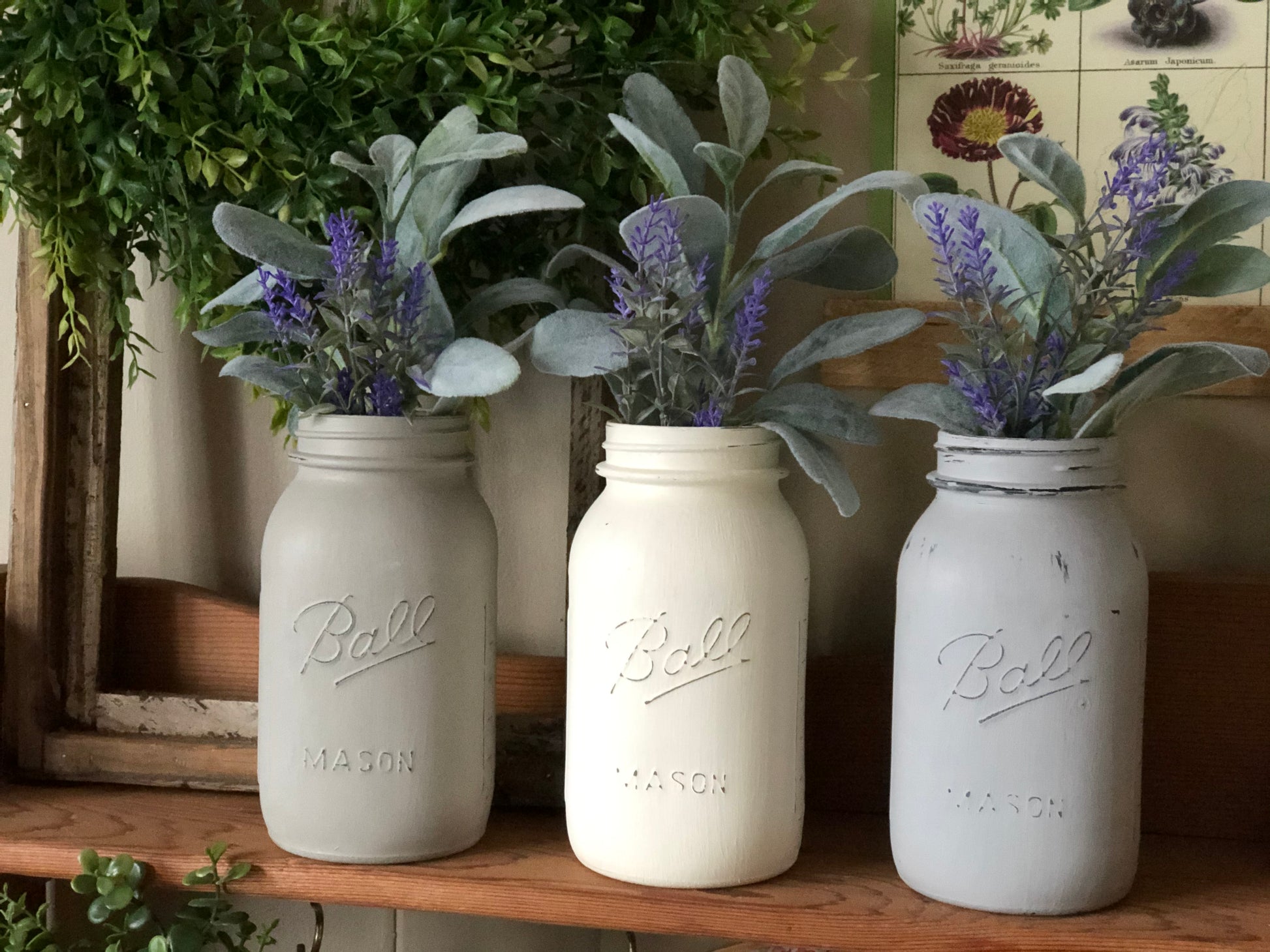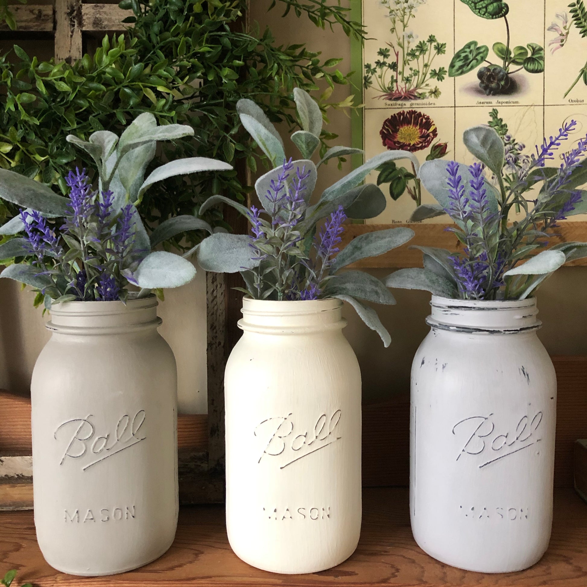 Great for your farmhouse decor - change out the floral with the seasons! Includes set of 3 painted mason jars and faux floral. For single mason jars, please indicate your color (cream, grey or dark beige) and floral (lavender, lambs ear or mix) at checkout.