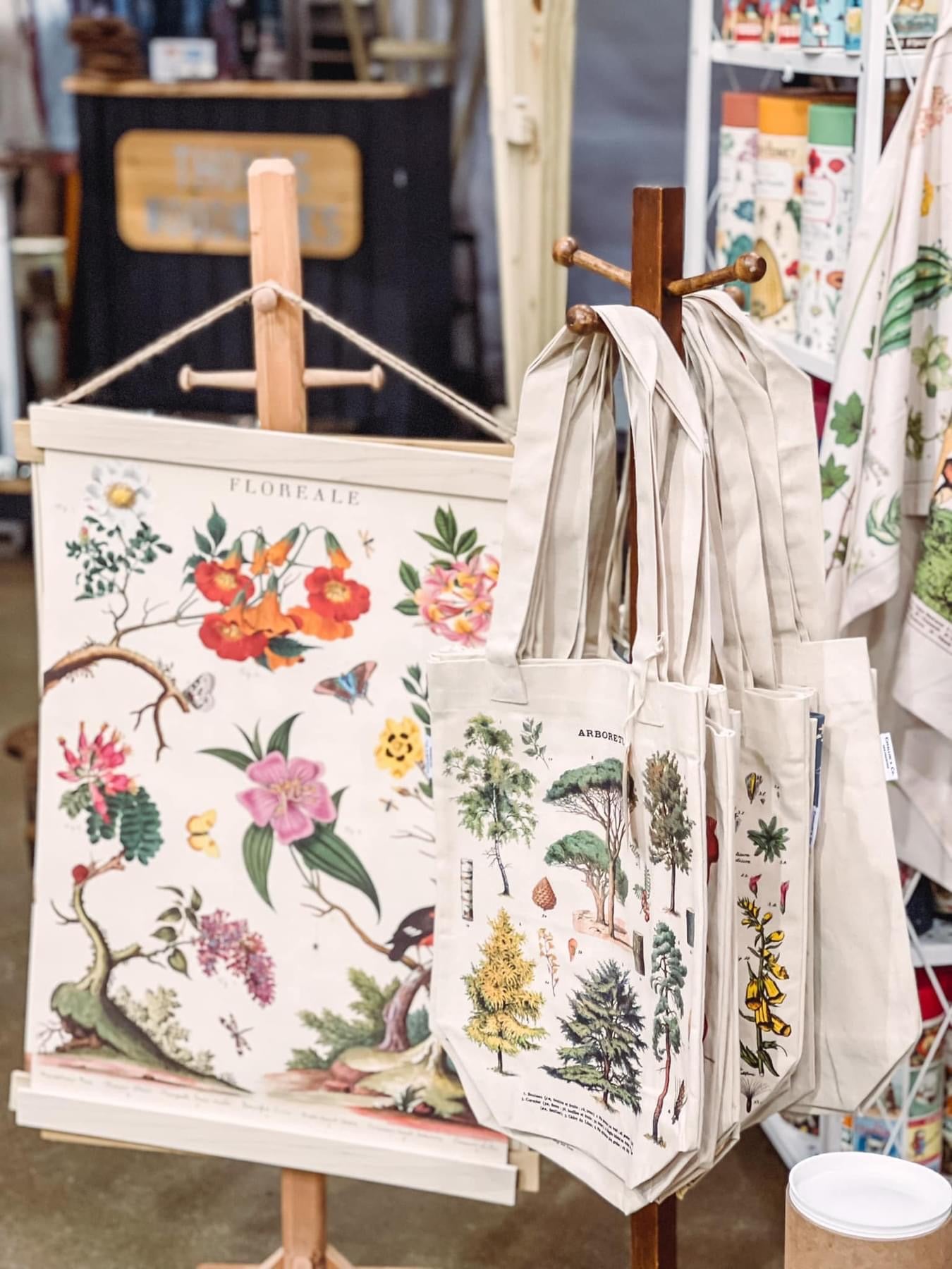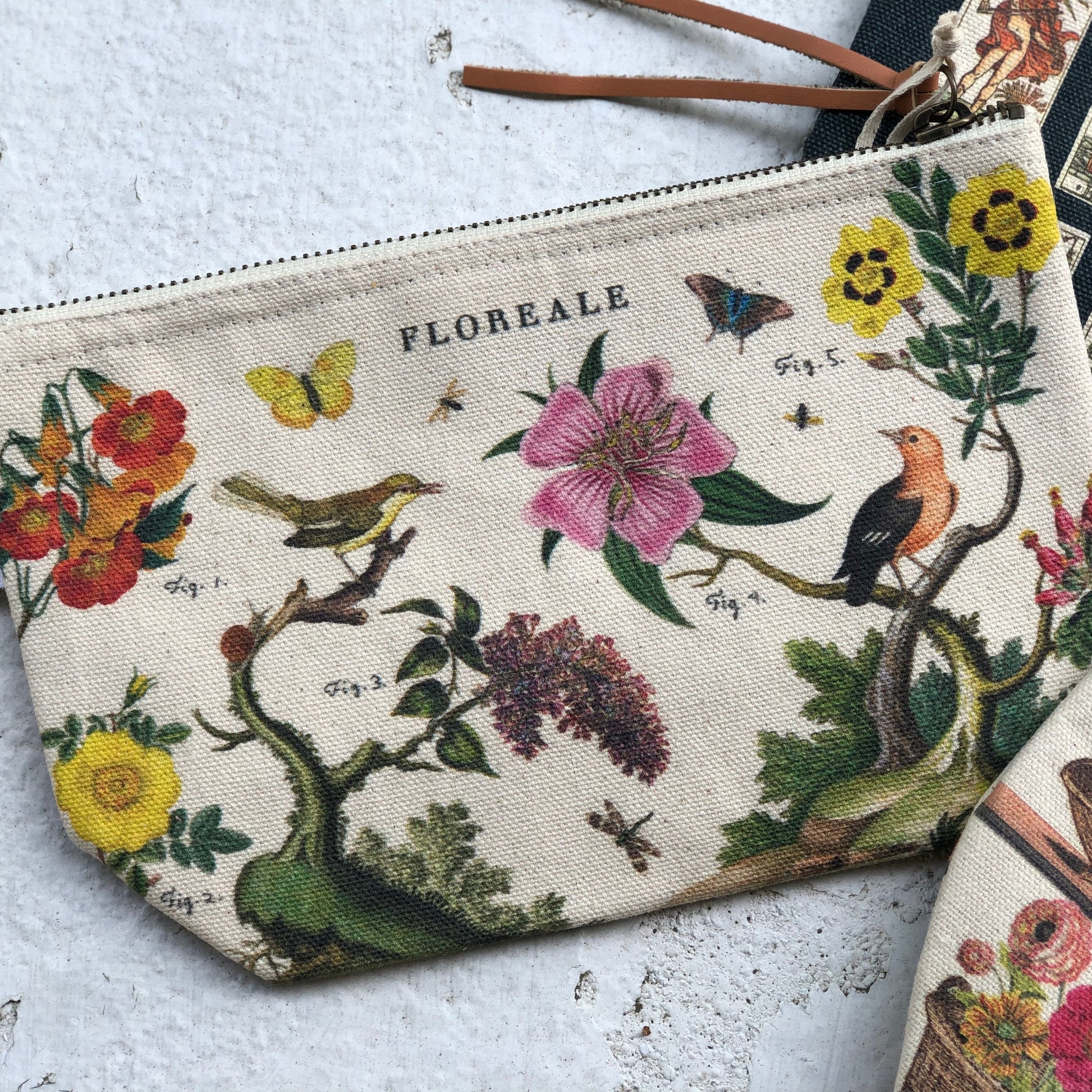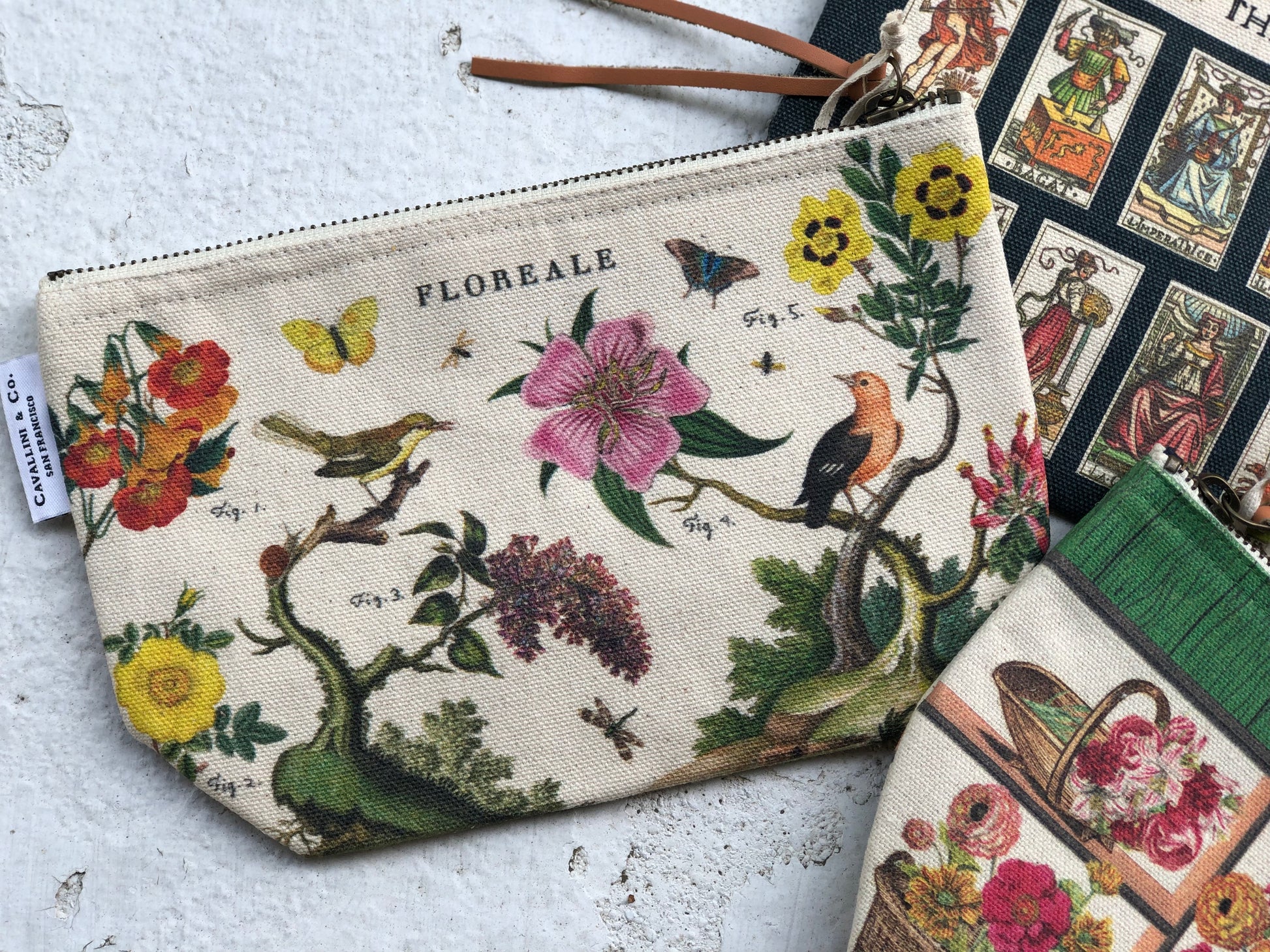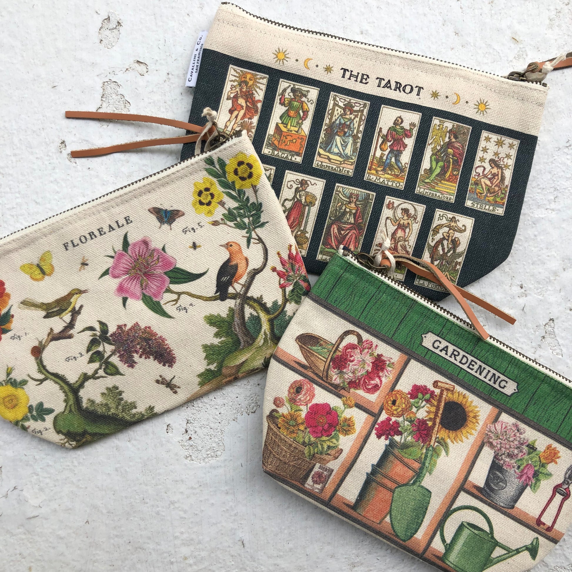 Made of 100% cotton with a lined interior and leather zipper pull. Identical print on both sides. Measures 8.75" x 6" x 3”. Spot clean only.
