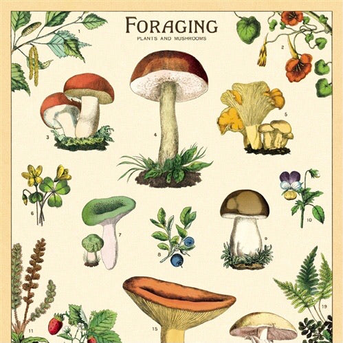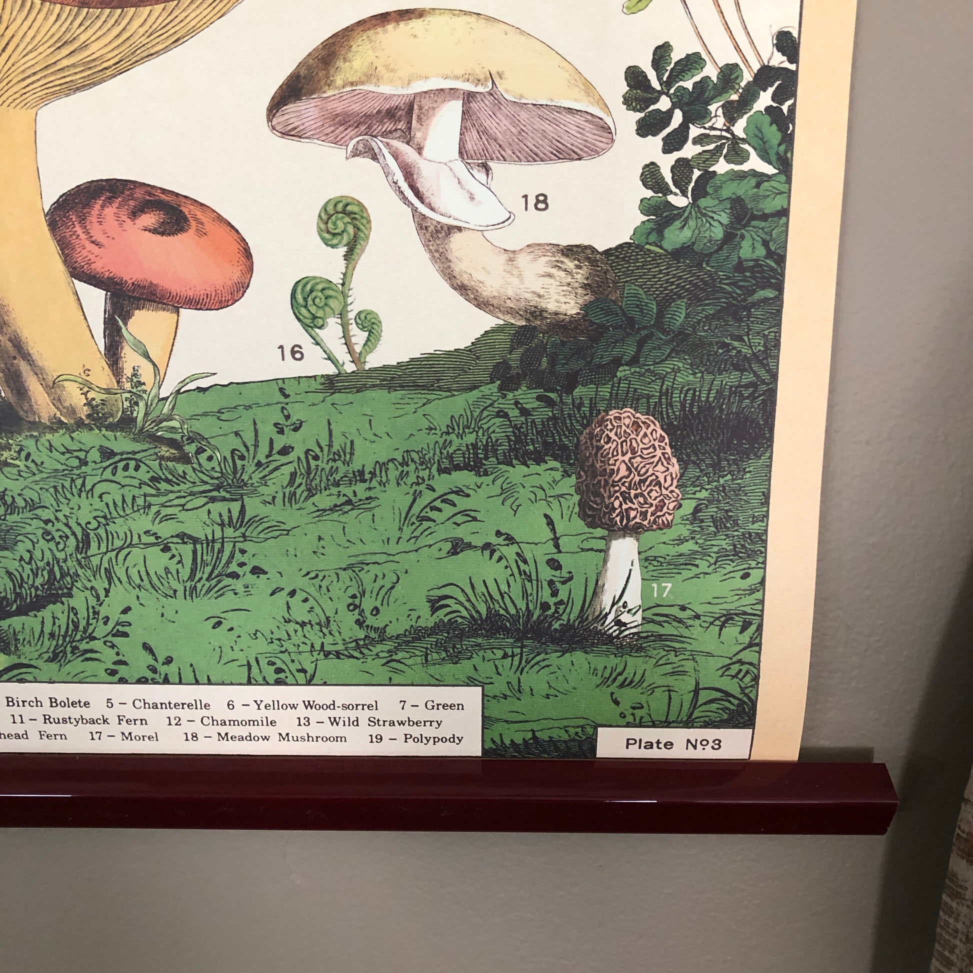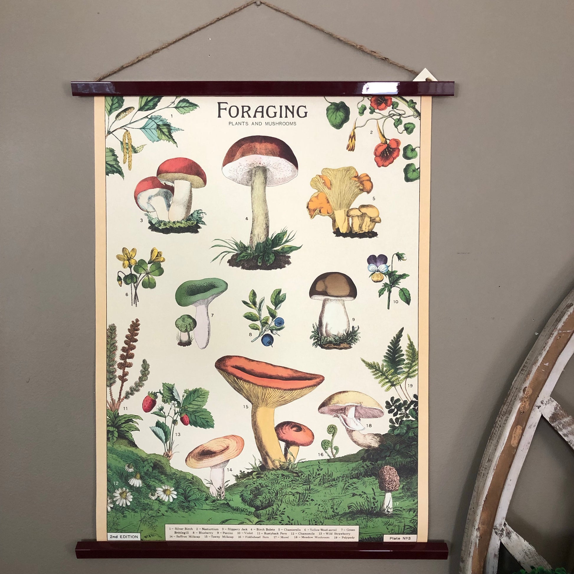 Get ready for garden planting with this vintage reproduction print of foraging species including plants and mushrooms. Purchase poster or upgrade to a poster with a wood hanger - wood planks bookend the top and bottom of poster and finished with jute string for hanging, modeled after vintage school charts. Choose from a variety of hanger colors by selecting from the drop down.