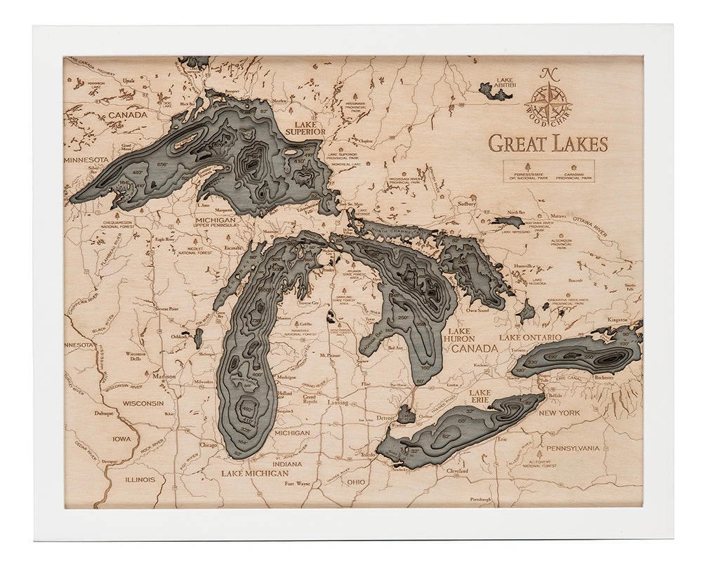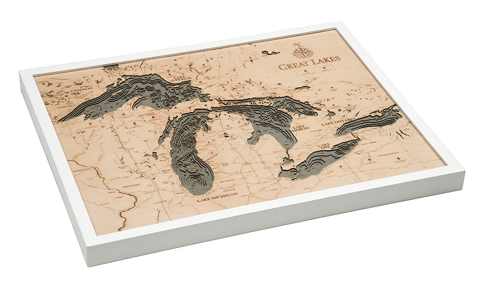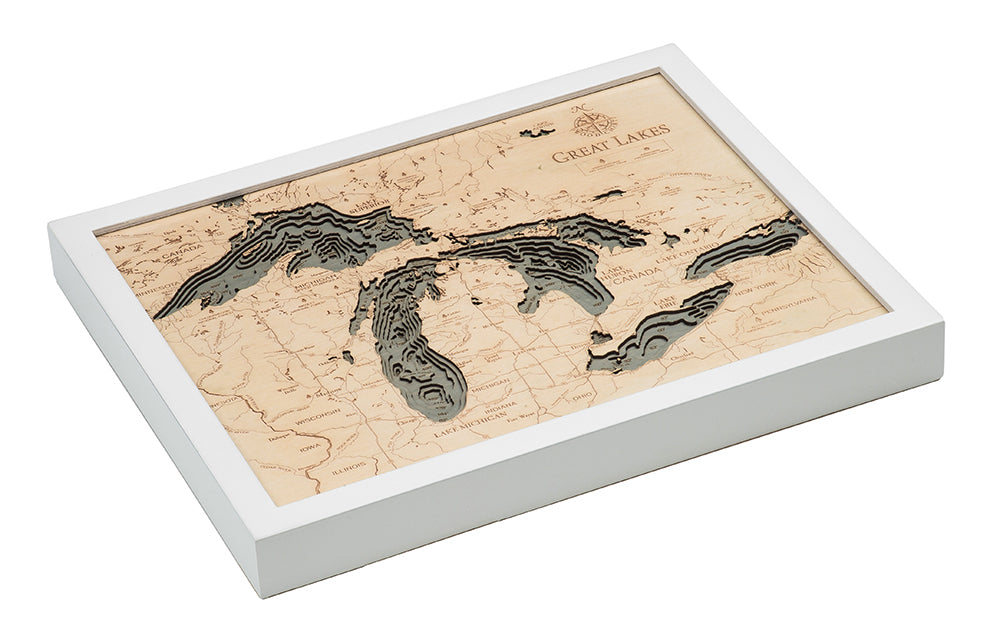This beautiful map of the Great Lakes is a 3-D nautical wood map of the Great Lakes region. The Great Lakes are a collection of freshwater lakes which connect to the Atlantic Ocean through the Saint Lawrence Seaway and the Great Lakes Waterway. Consisting of Lakes Superior, Michigan, Huron, Erie, and Ontario, they form the largest group of freshwater lakes on Earth, containing 21% of the world's surface fresh water. When you’re searching for unique gift ideas for the aquatic lover in your life, look no further than a Great Lakes nautical map.