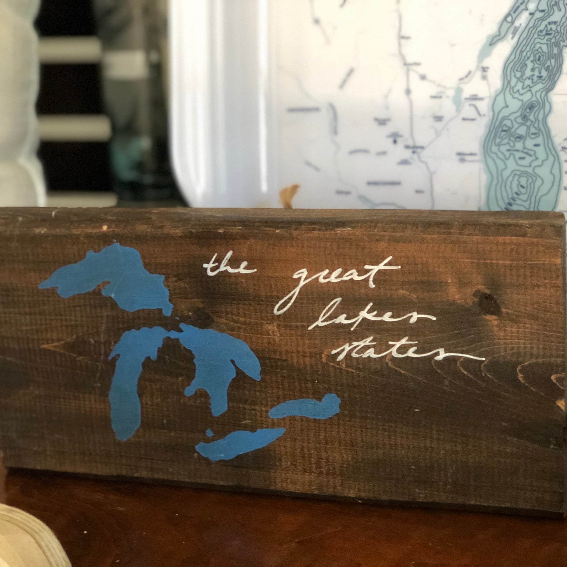 Made from the leftover white cedar and pine used in our Michigan Adirondack Chairs, these signs make the perfect compliment to any desk, bookshelf or display. These signs are first stained then hand painted with our marvelous Great Lakes with some slight distressing. Metal sawtooth hanger.