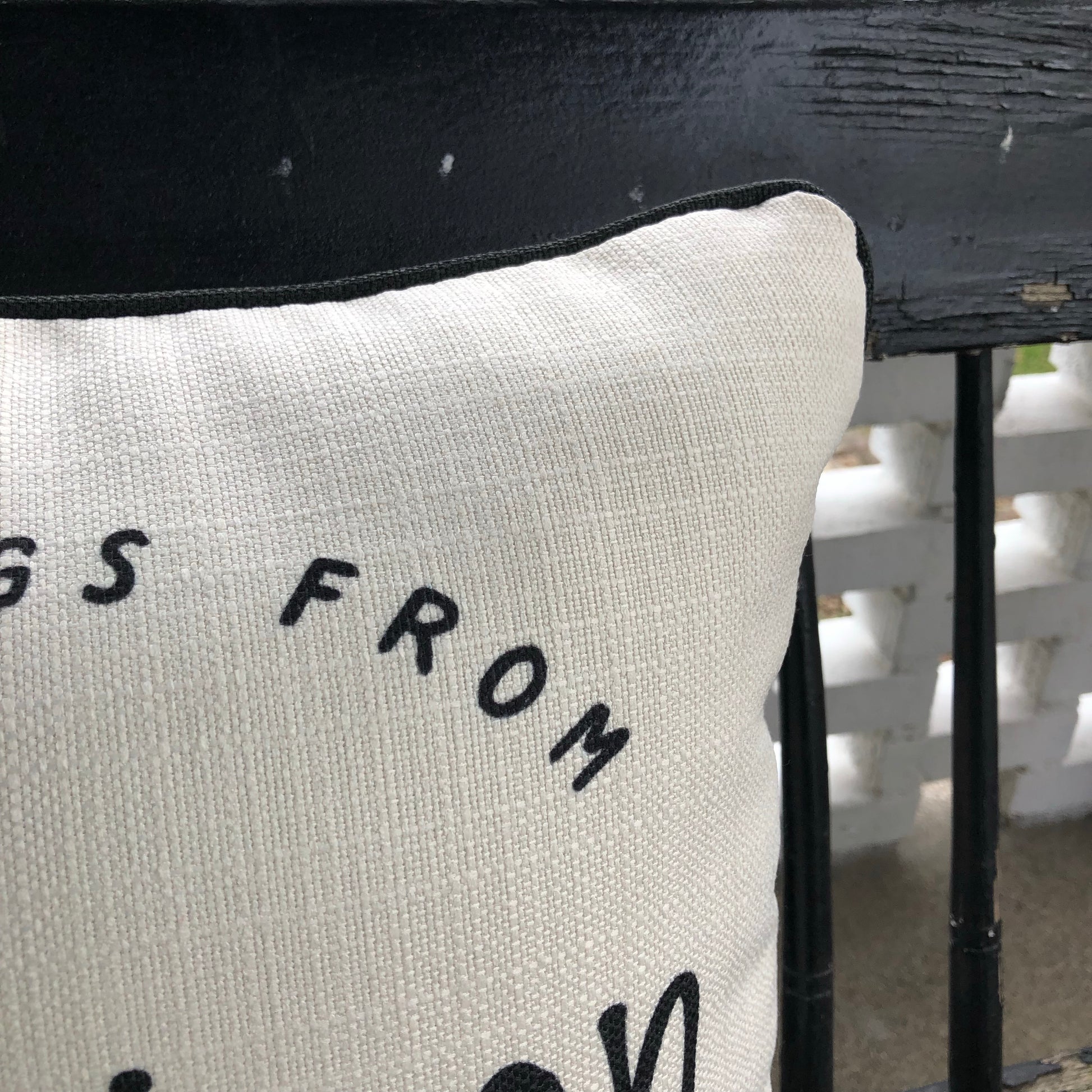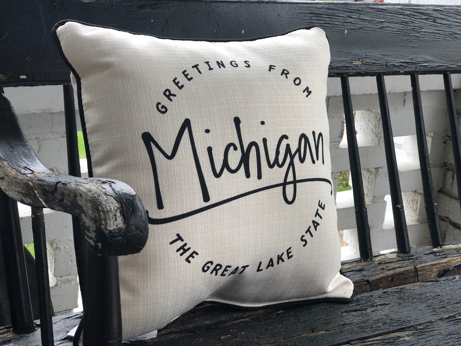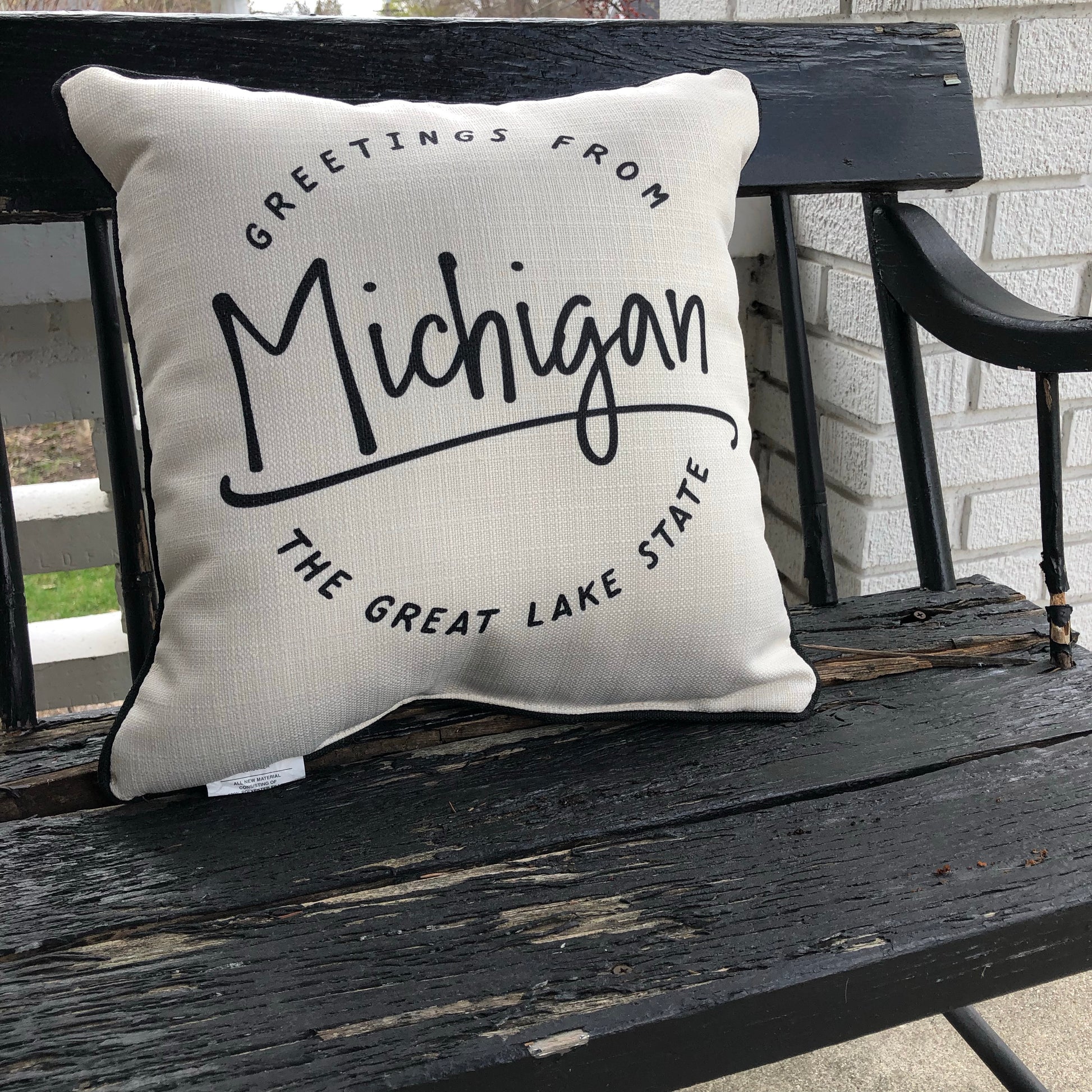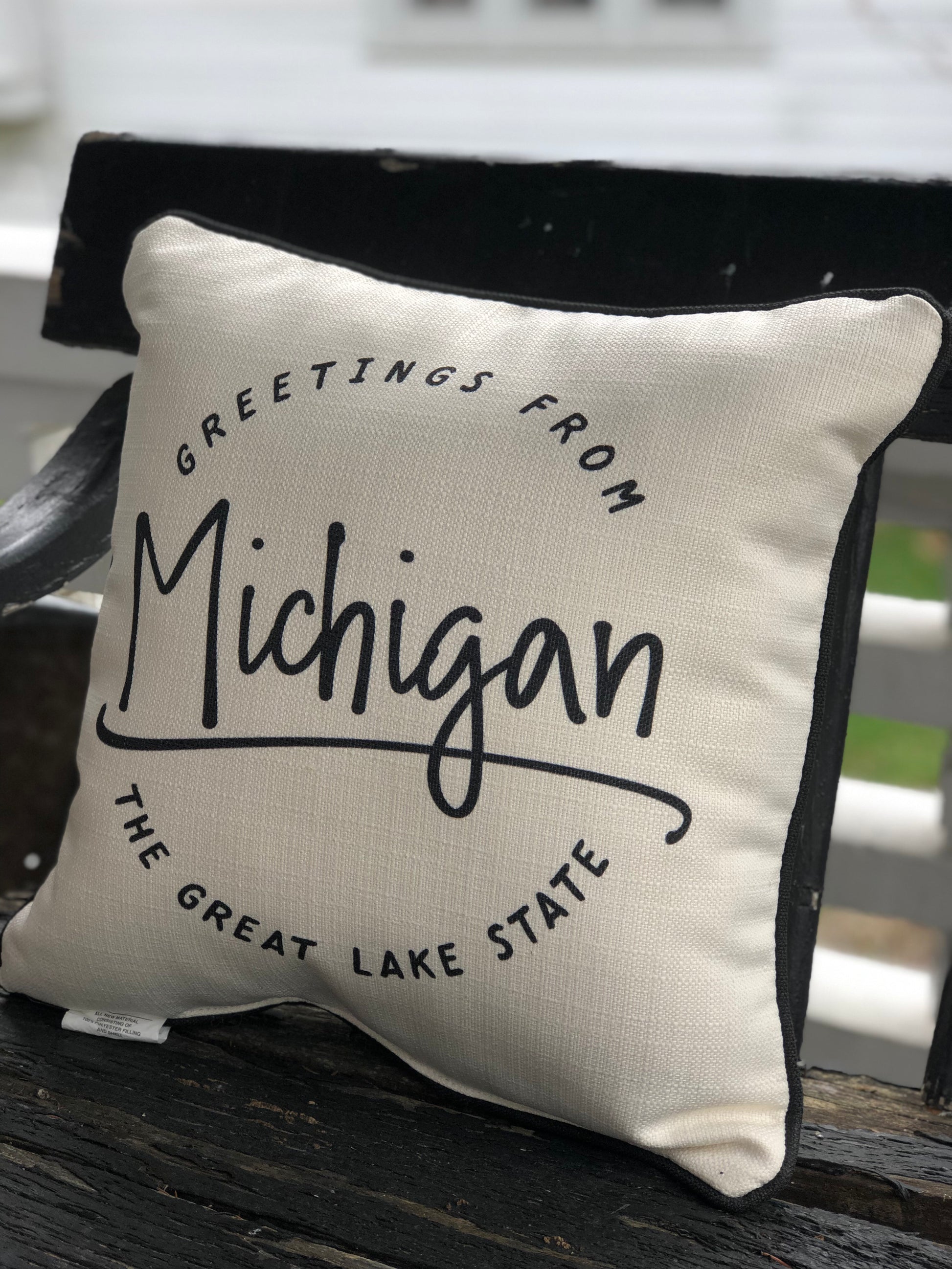 This farmhouse pillow is the perfect addition to your home - neutral and black will coordinate well in your home. The pillow states Greetings from Michigan, the Great Lake State.