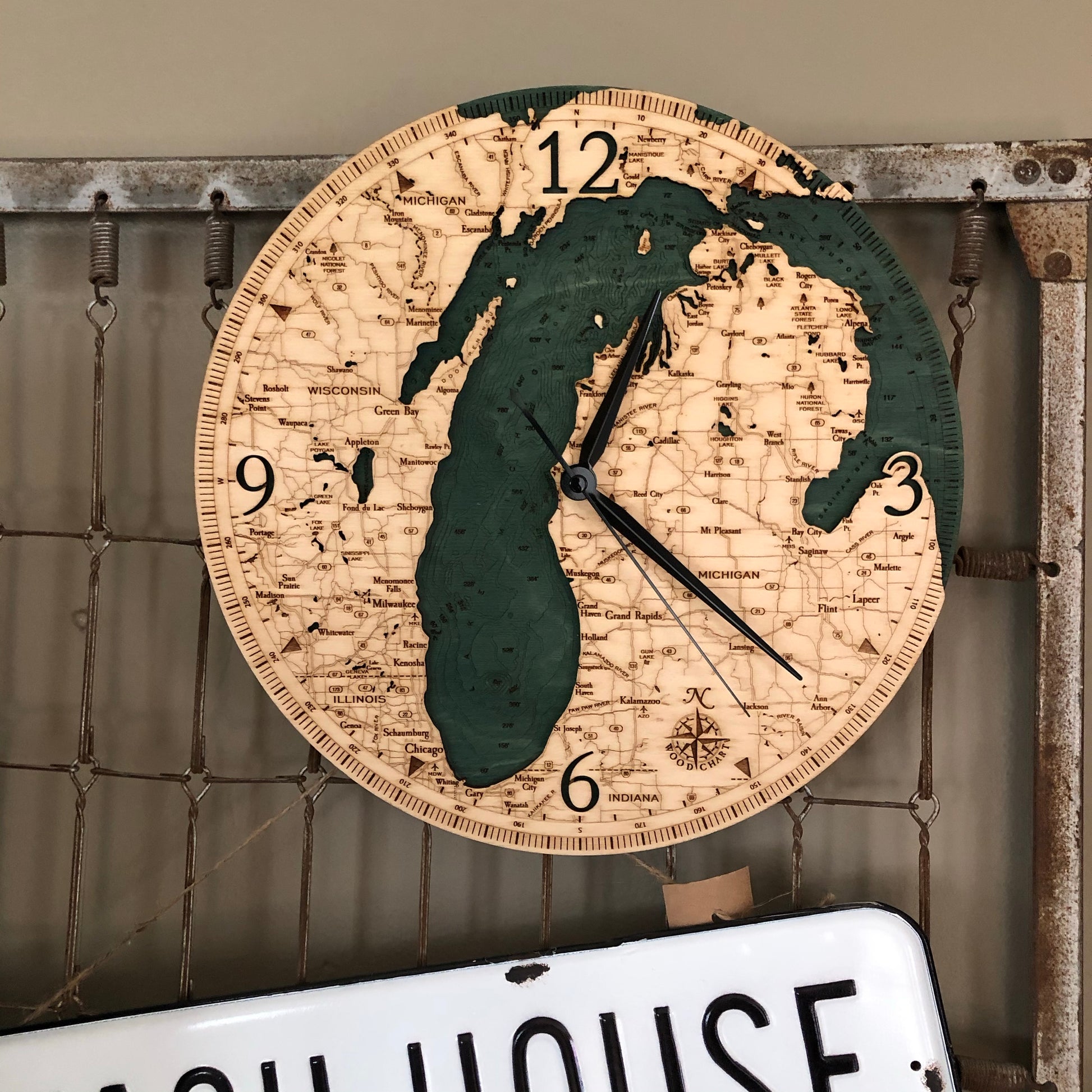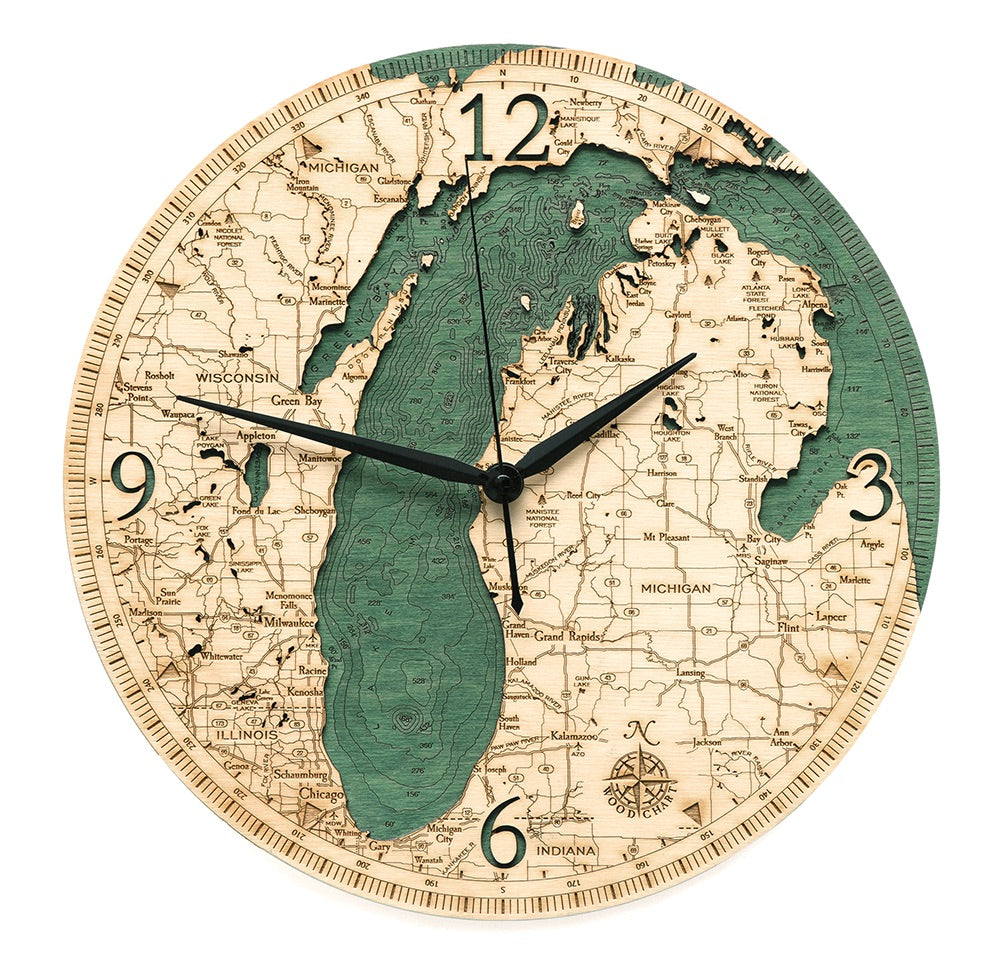 This clock features a map of Lake Michigan, one of the five Great Lakes of North America and the only one located entirely within the United States.