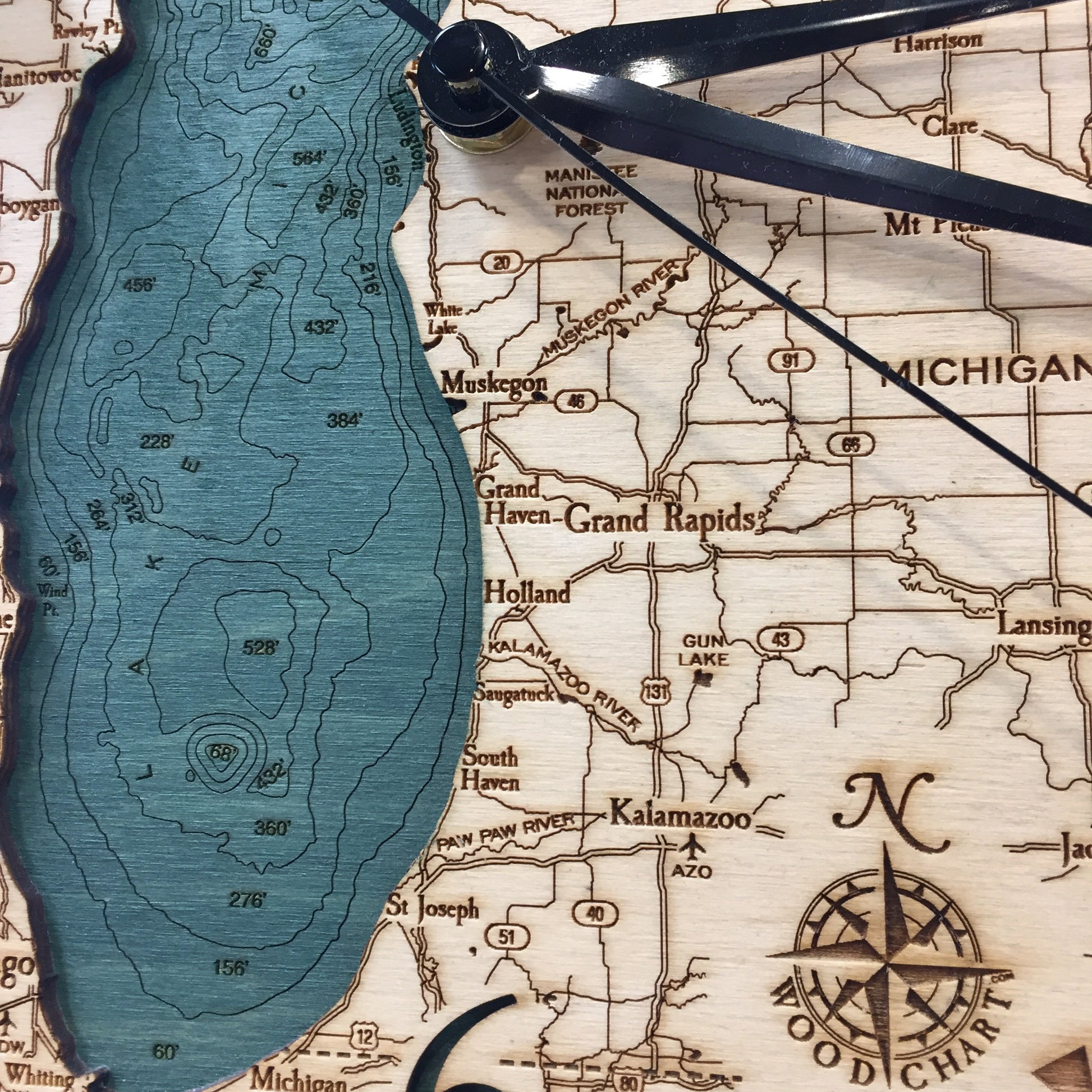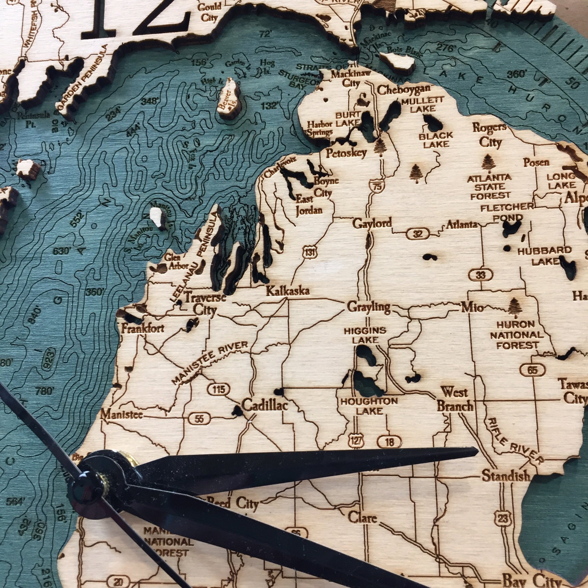 Clock measures 12" and is made from Baltic birch. The development is slightly different than our other wood art, as this shows one layer of the water depths vs multiple layers. Requires 1 (one) AA battery. Please note these ship directly from the maker, located in Michigan.