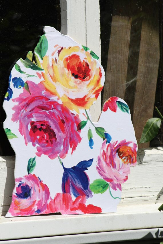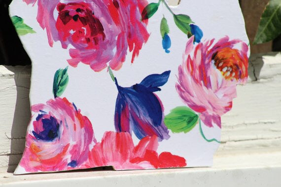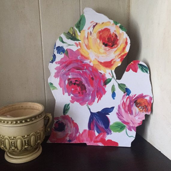 This Michigan floral sign adds charm to your home! Prop on a bookshelf or add to your gallery wall. Please note the placement of the print may vary some. Two options available: pink or purple floral. Let us know if you’d like a jute hanger for easy hanging on your wall.