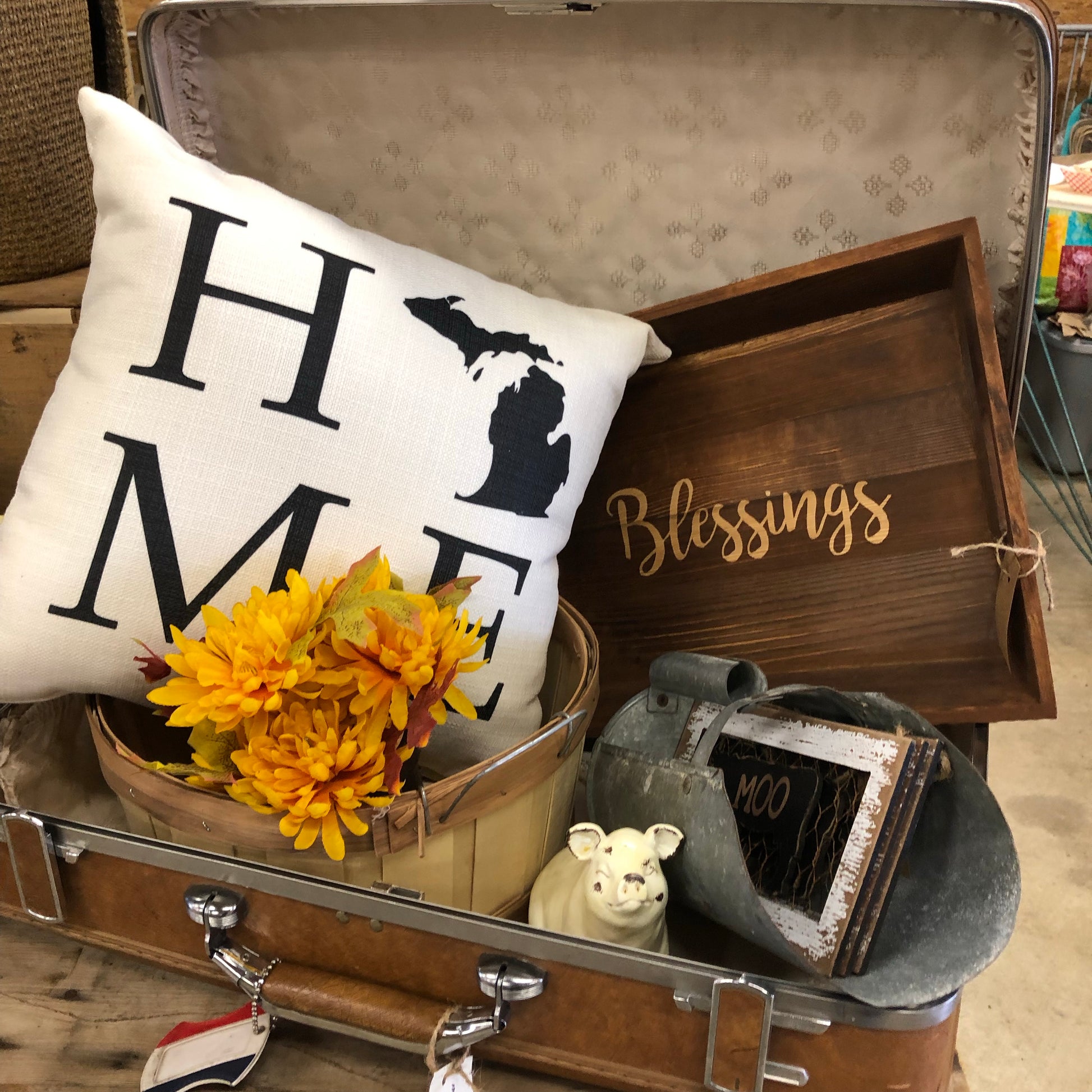 Pillow features “Home” in black print on a neutral background which will complement any decor.