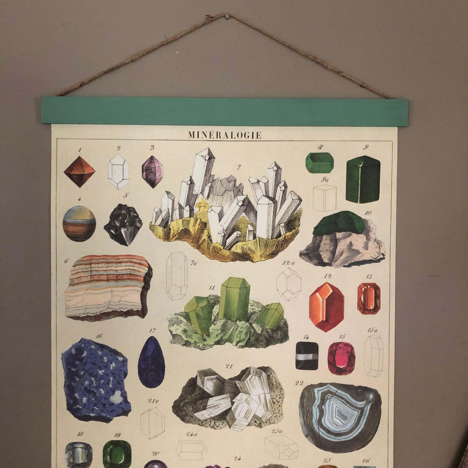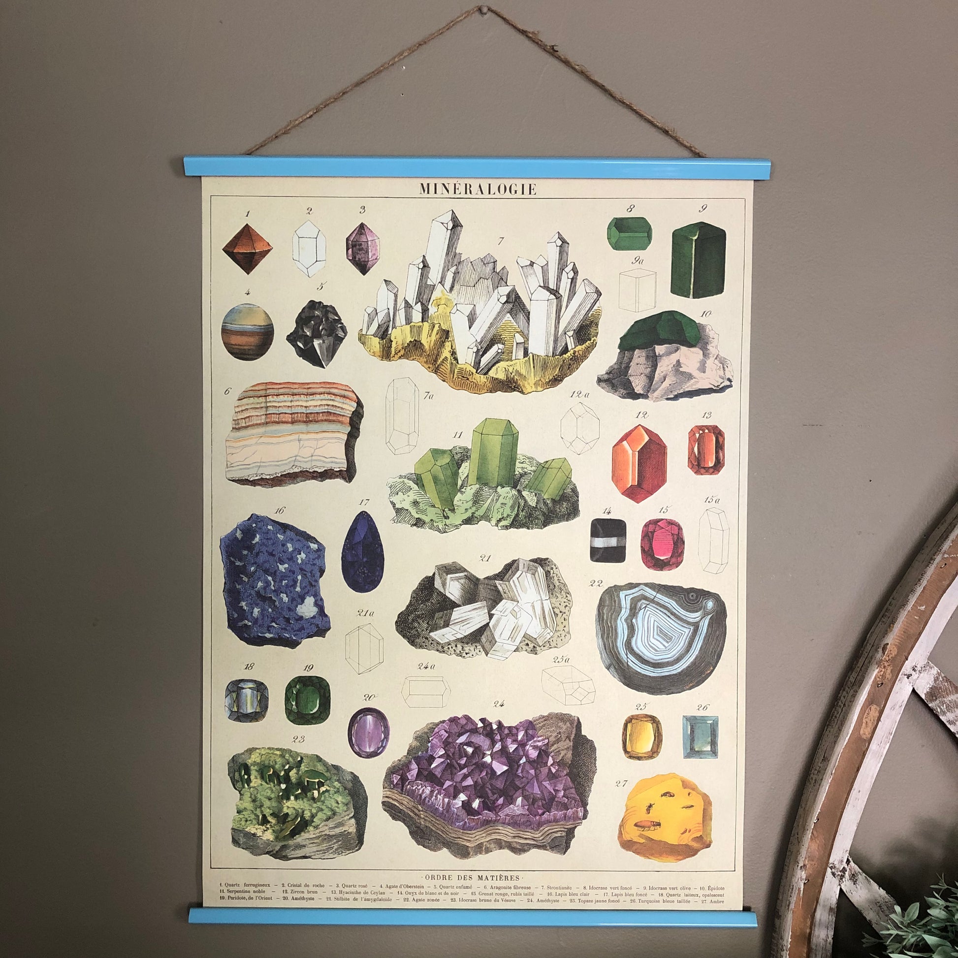 Add vintage feel to your home with this bold print featuring mineral types. Purchase poster individually or upgrade to a permanent wood hanger — wood planks bookend the top and bottom of the minerals print and finished with a jute string for easy hanging. Choose from a variety of hanger colors.