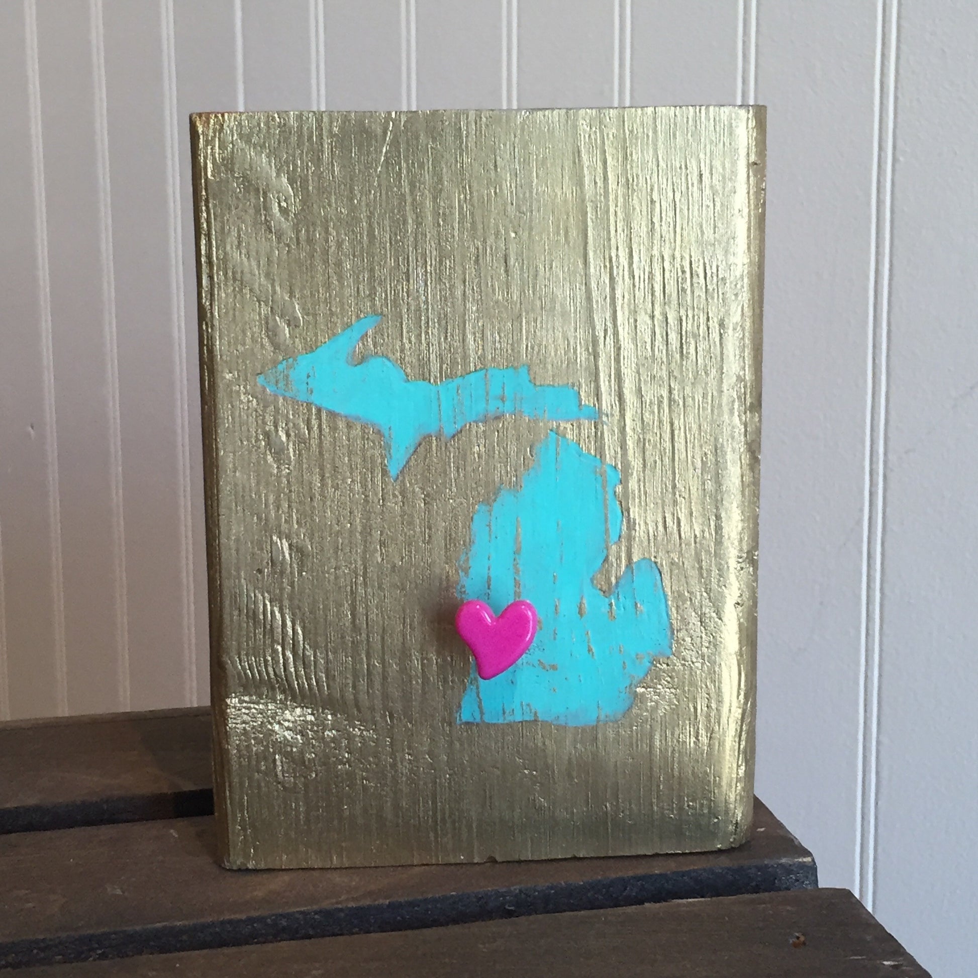This Michigan block sign is the perfect size for your bookshelf, desk or part of a wall collage. Made from reclaimed wood, this is hand painted with the great state of Michigan and finished with some light distressing. Includes a small pink heart to place wherever home is!