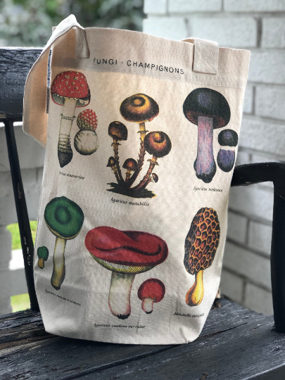 This will be your new favorite bag when shopping at your Farmer's Market! Canvas material features a vintage mushroom print on one side. Made of 100% natural cotton canvas. Measures 13" x 17" x 5.5" and has an interior pocket. Please note the unique shape of this tote bag - meant for wider items without the boxy look! Spot clean only.