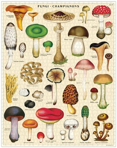 This 1,000 piece jigsaw puzzle of “champignons” or mushrooms will provide countless hours of fun. Completed puzzle measures 22" x 28". Comes in a muslin bag inside tube with insert of finished puzzle.