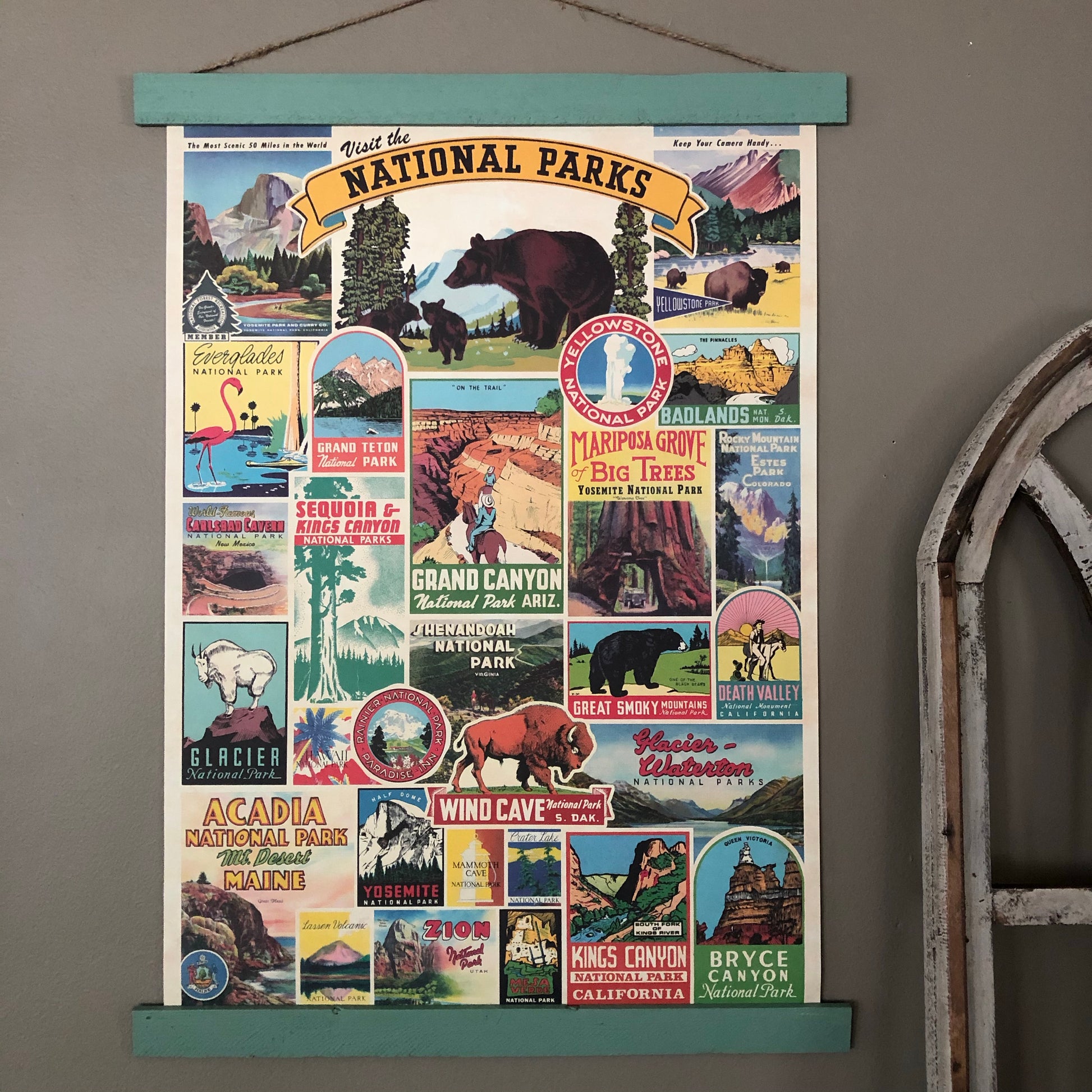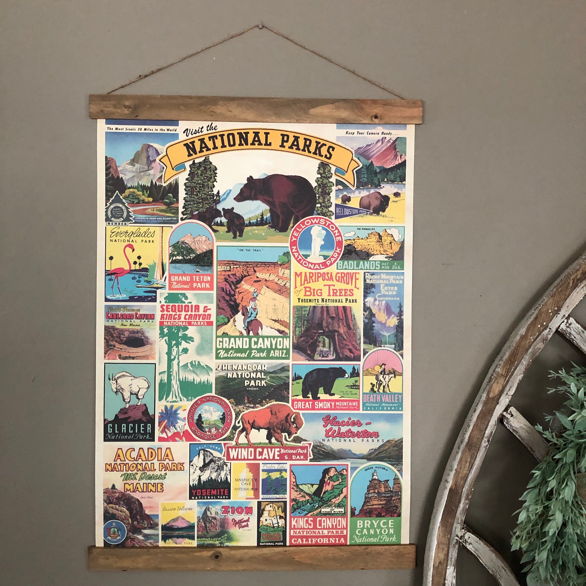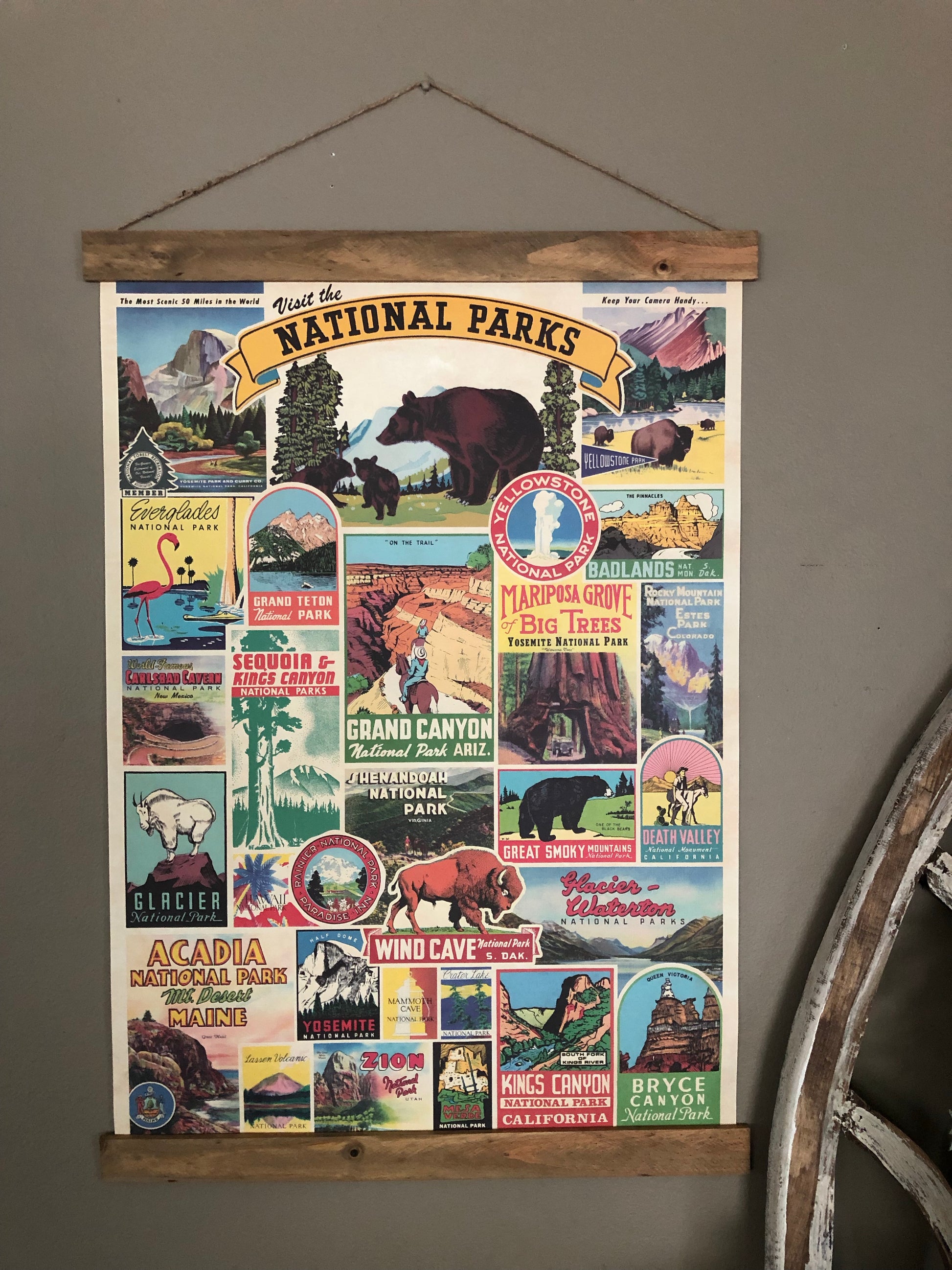 Add vintage feel to your home with this print featuring many of our wonderful National Parks in a collage format. Purchase poster individually or upgrade to a permanent wood hanger - wood ends bookend the top and bottom of the poster and finished with a jute string for easy hanging. Choose from a variety of hanger colors by selecting from the drop down (pictures will update with selection).