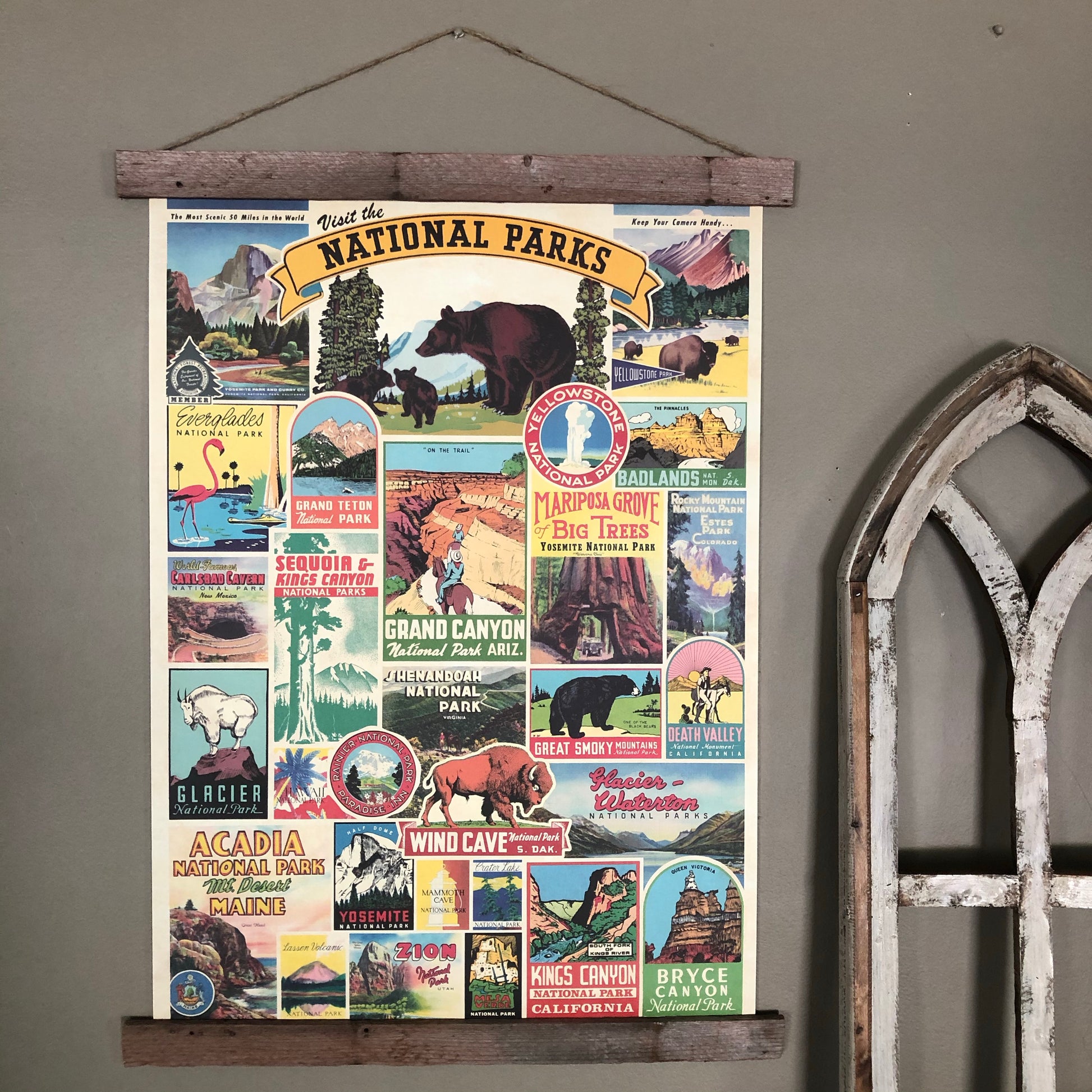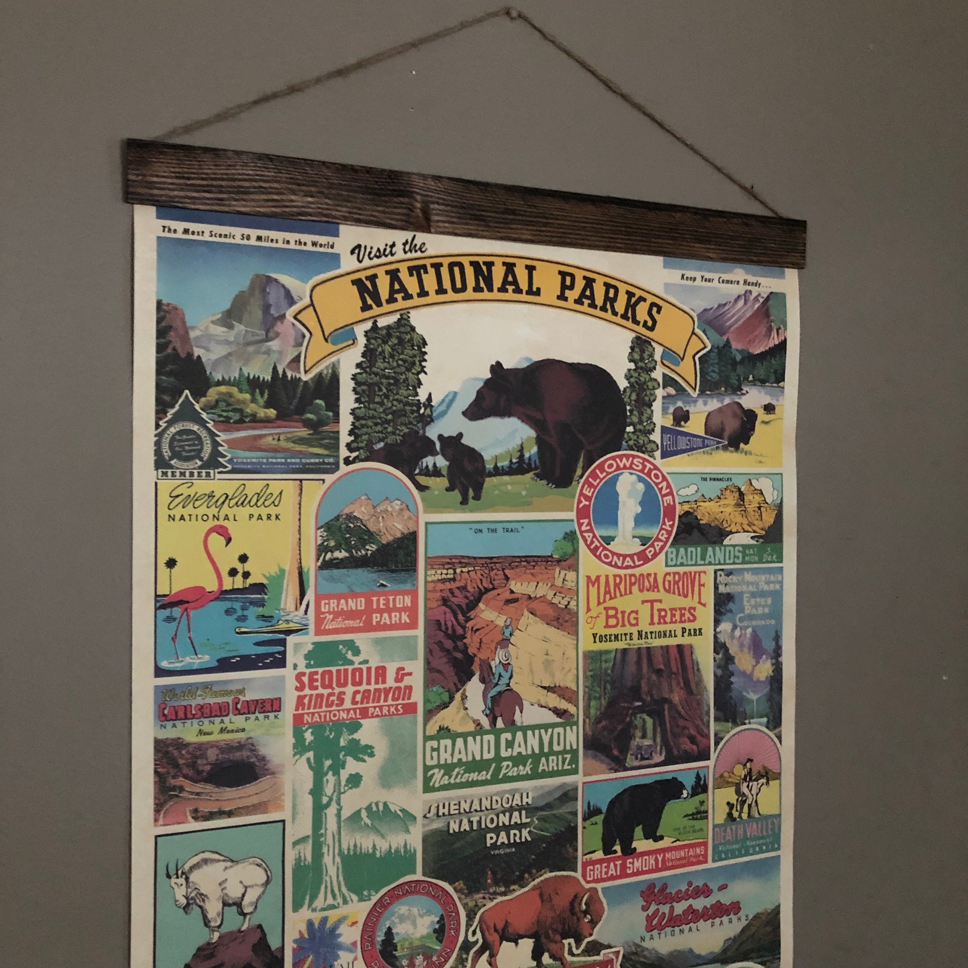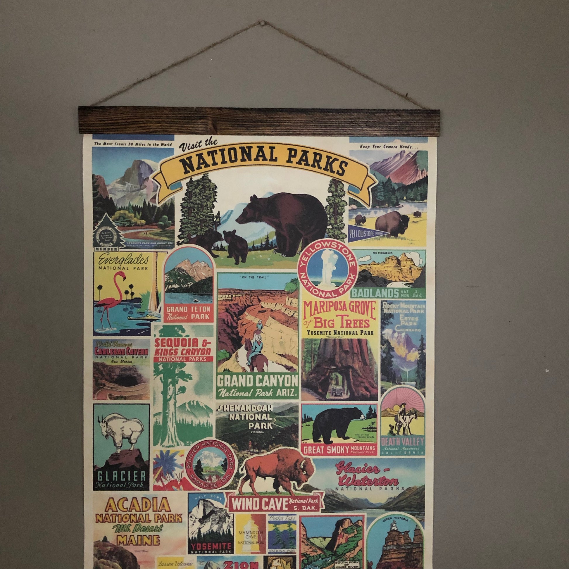 Add vintage feel to your home with this print featuring many of our wonderful National Parks in a collage format. Purchase poster individually or upgrade to a permanent wood hanger - wood ends bookend the top and bottom of the poster and finished with a jute string for easy hanging. Choose from a variety of hanger colors by selecting from the drop down (pictures will update with selection).