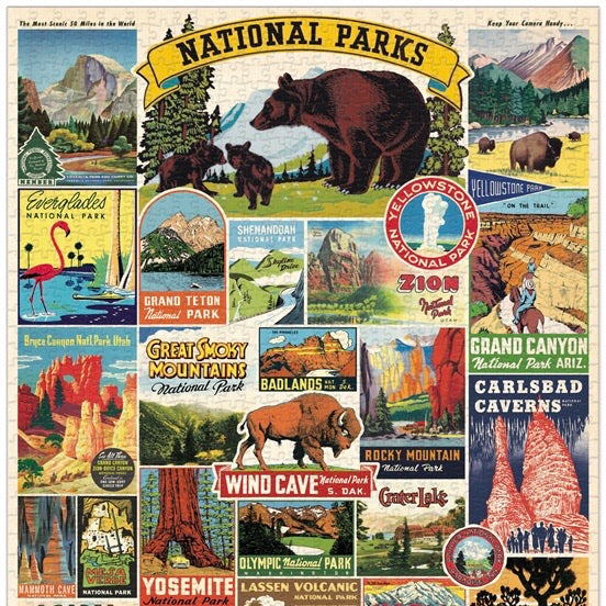 Love our National Parks print (picture 4)? Now available as a puzzle! This 1,000 piece puzzle will provide countless hours of fun. Completed jigsaw puzzle measures 22" x 28". Comes in a muslin bag inside tube with insert of finished puzzle.