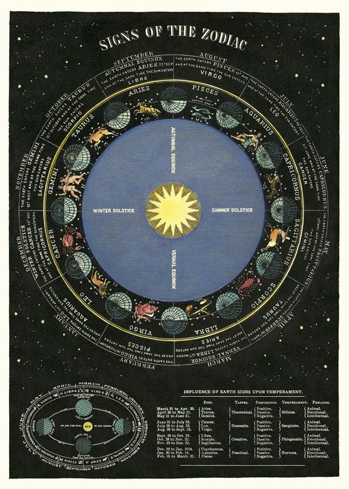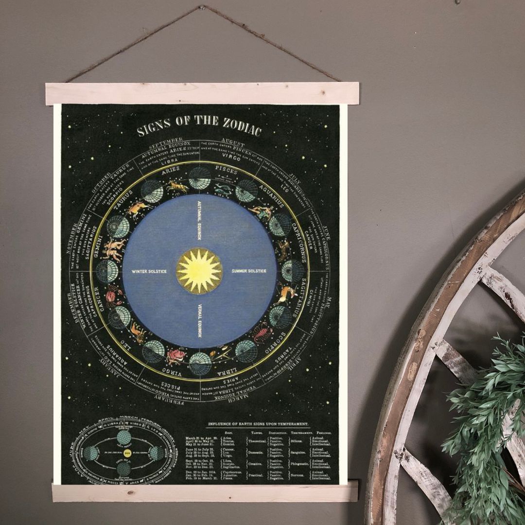 Signs of the zodiac, now available in a vertical print. Purchase poster individually or upgrade to a permanent wood hanger — wood planks bookend the top and bottom and finished with a jute string for easy hanging. Choose from a variety of hanger colors by selecting from the drop down.