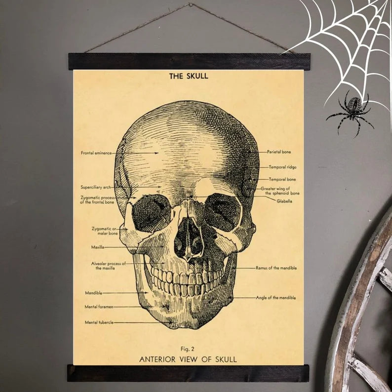 Get ready for Halloween, or anytime of the year, with this vintage look skull poster chart. Purchase poster individually or upgrade to a permanent wood hanger — wood planks bookend the top and bottom and finished with a jute string for easy hanging. Choose from a variety of hanger colors by selecting from the drop down.