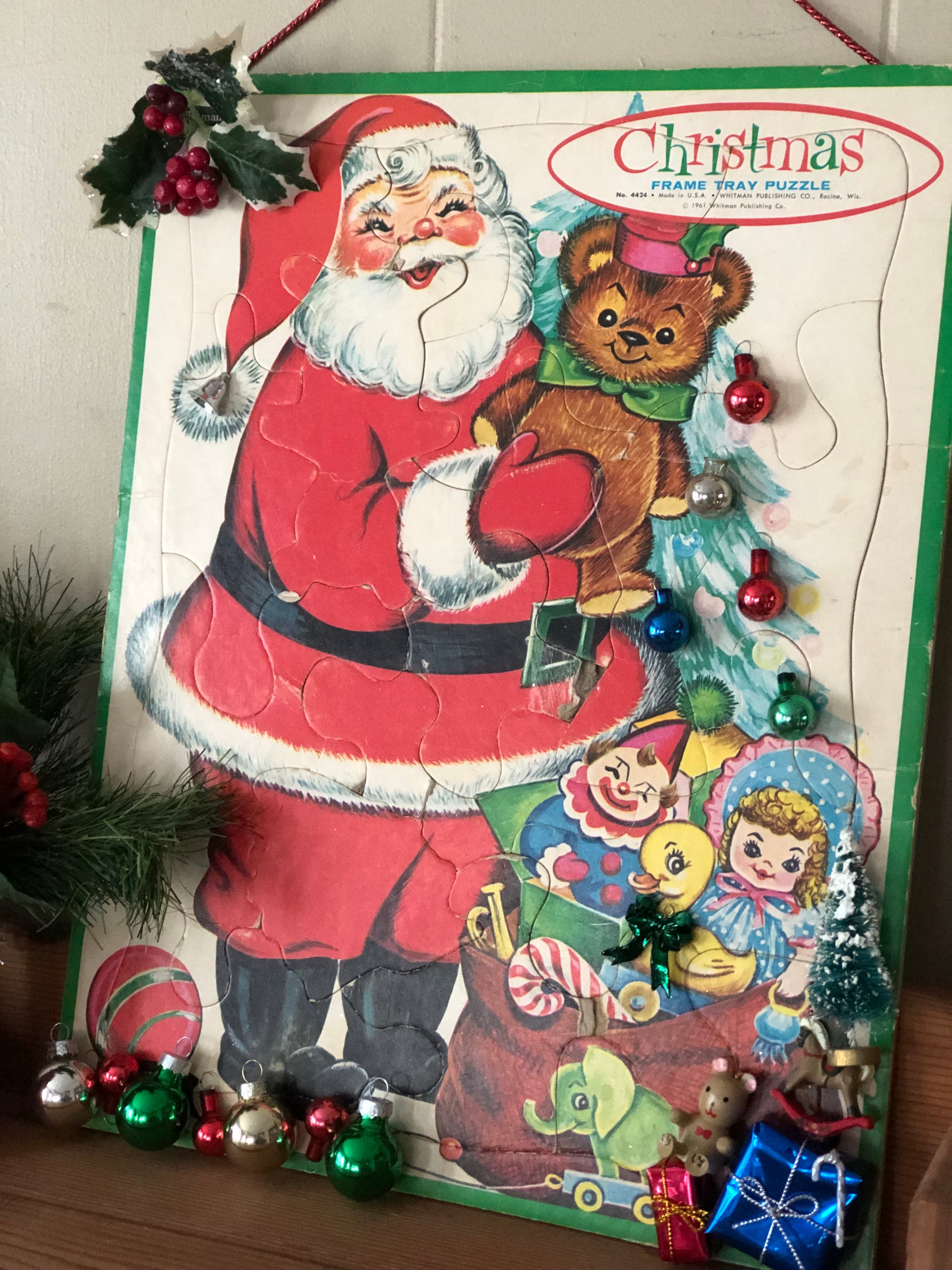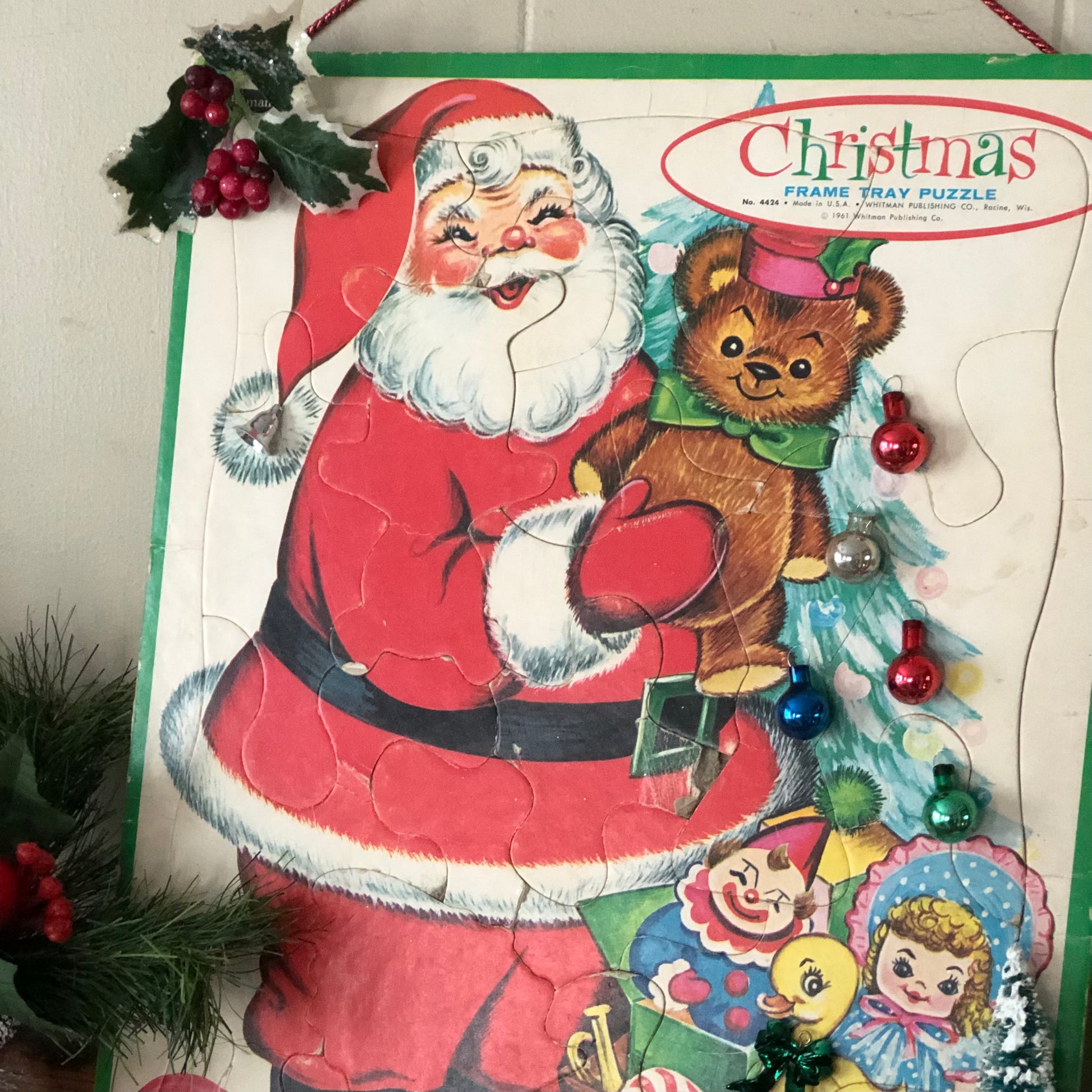 The perfect addition to your vintage Christmas kitsch collection! A vintage puzzle has been repurposed in a wall hanging, adorned with embellishments.