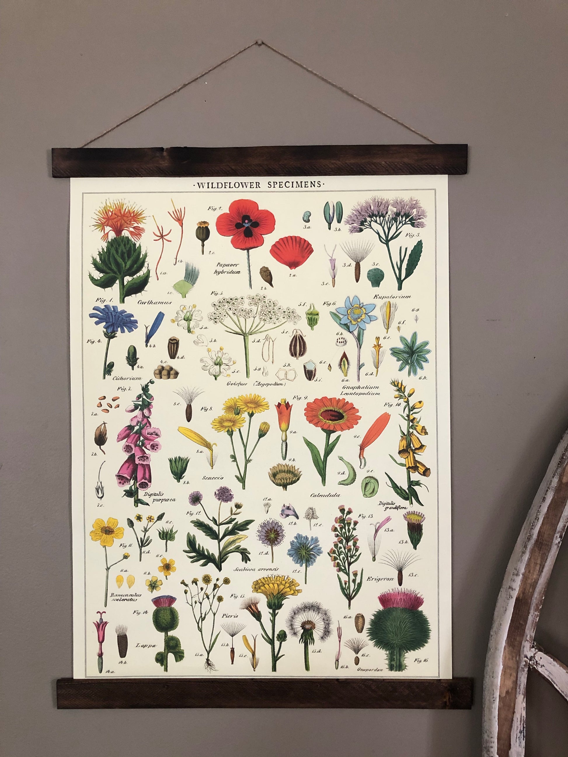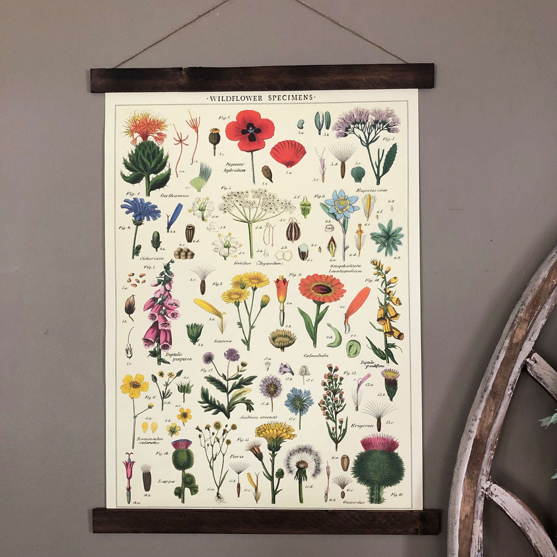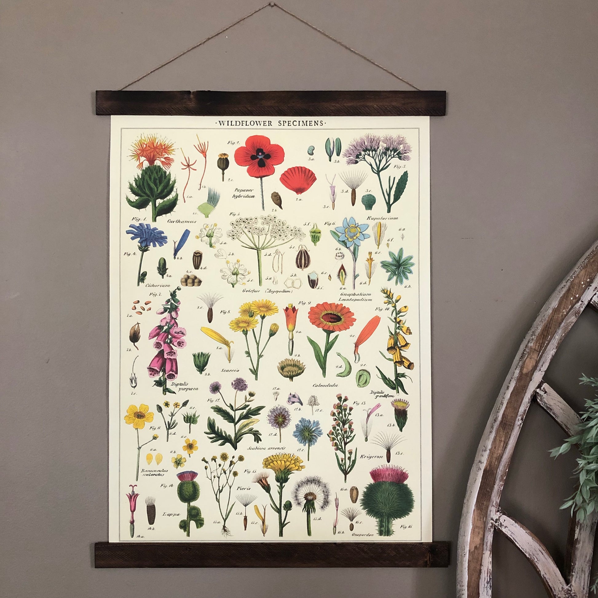 Add vintage feel to your home with this lovely wildflowers poster wall hanging. Purchase this floral print individually or upgrade to a permanent wood hanger — wood planks bookend the top and bottom and finished with a jute string for easy hanging. Choose from a variety of hanger colors by selecting from the drop down (pictures will update with selection).