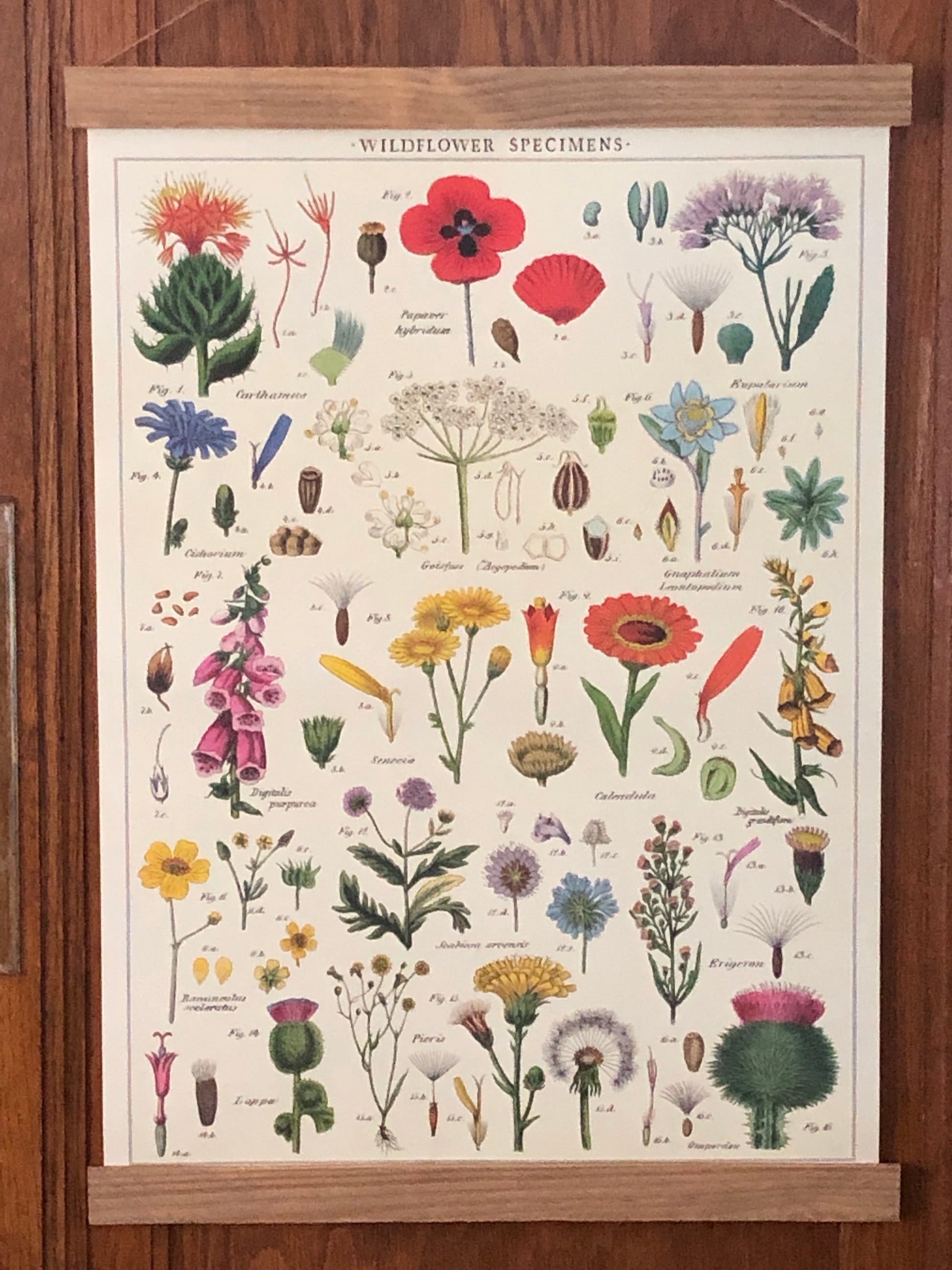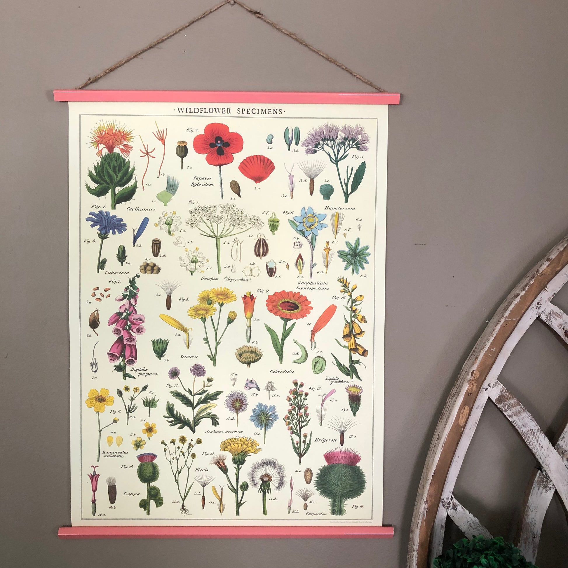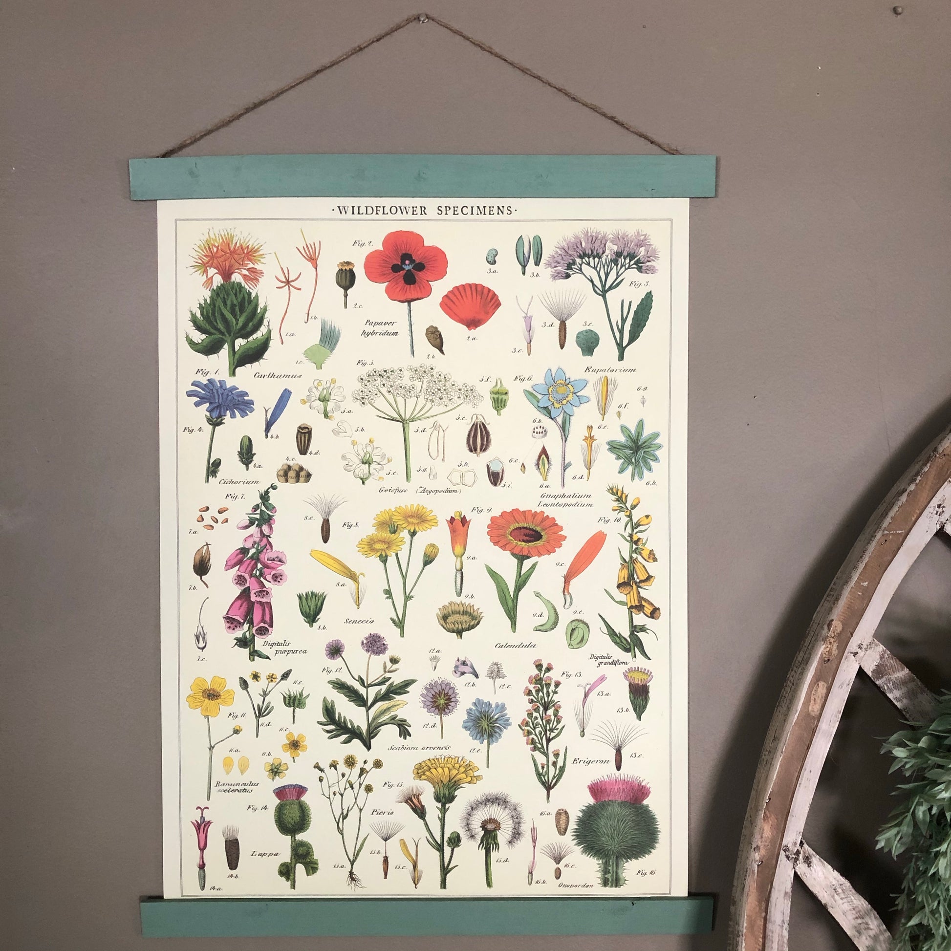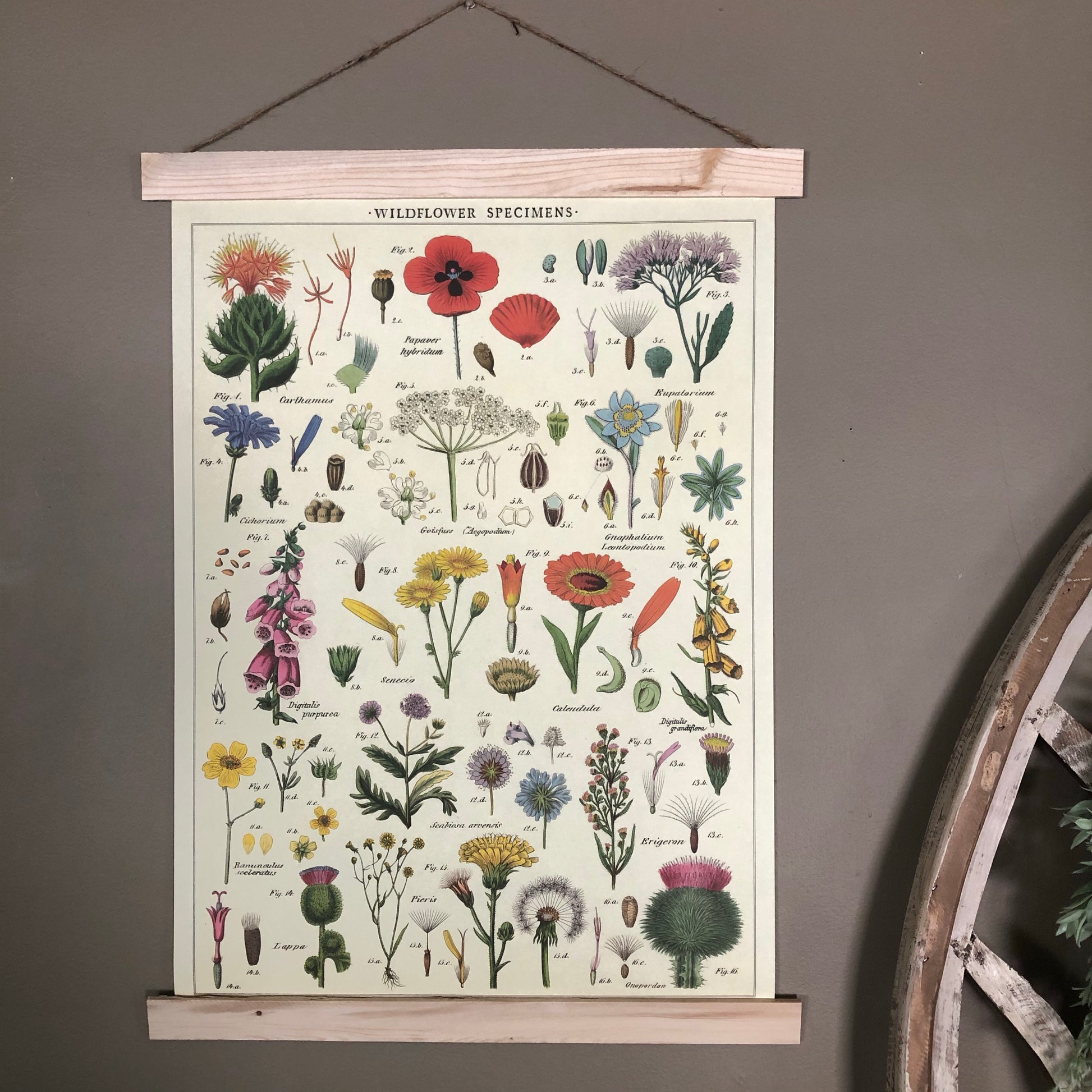 Add vintage feel to your home with this lovely wildflowers poster wall hanging. Purchase this floral print individually or upgrade to a permanent wood hanger — wood planks bookend the top and bottom and finished with a jute string for easy hanging. Choose from a variety of hanger colors by selecting from the drop down (pictures will update with selection).